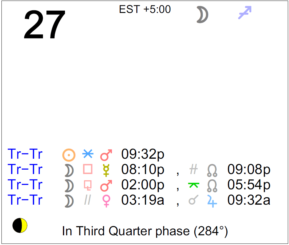 Planet Color Key: The longer the bar, the slower the aspecting planet and the longer the duration of the planet’s transit.