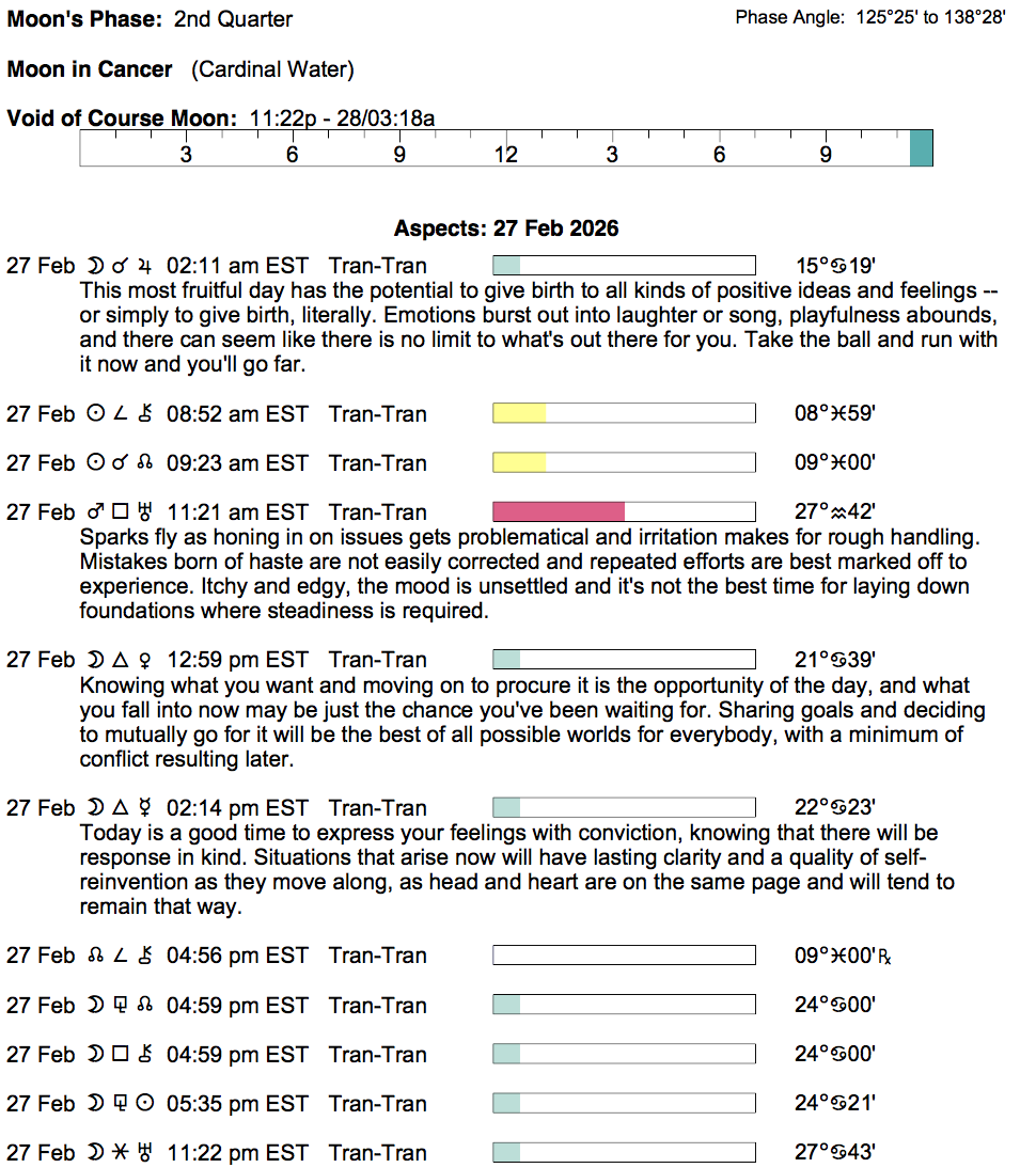 Planet Color Key: The longer the bar, the slower the aspecting planet, and the longer the duration of the planet’s transit.