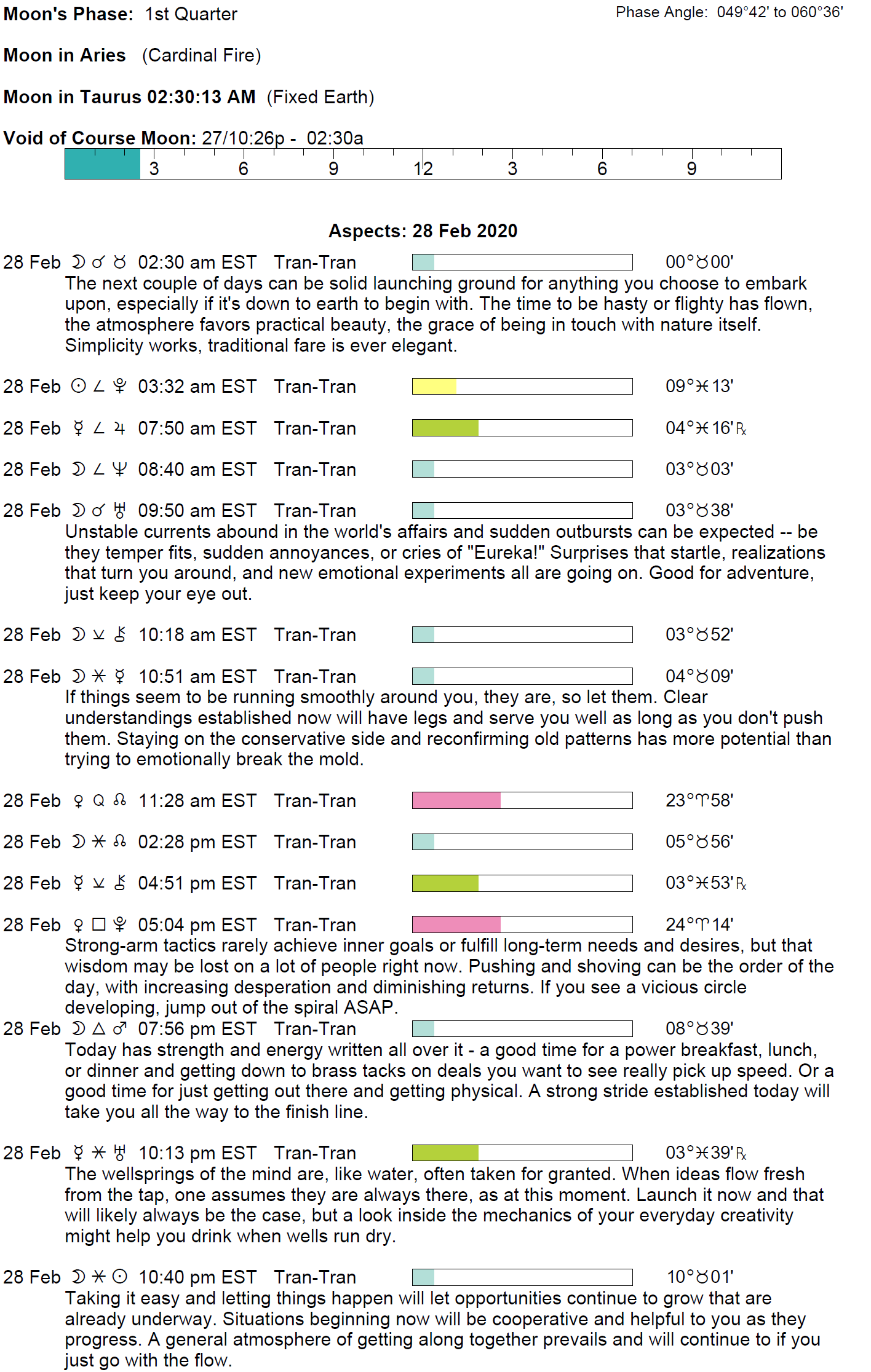 Planet Color Key: The longer the bar, the slower the aspecting planet and the longer the duration of the planet’s transit.