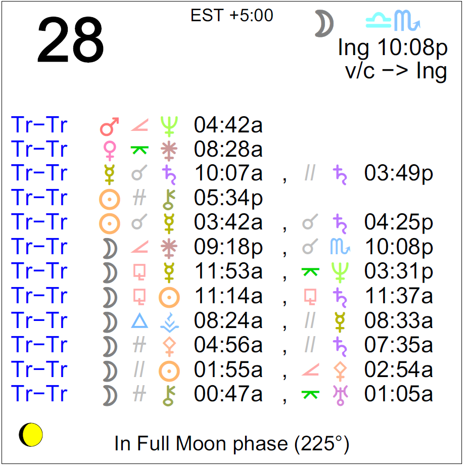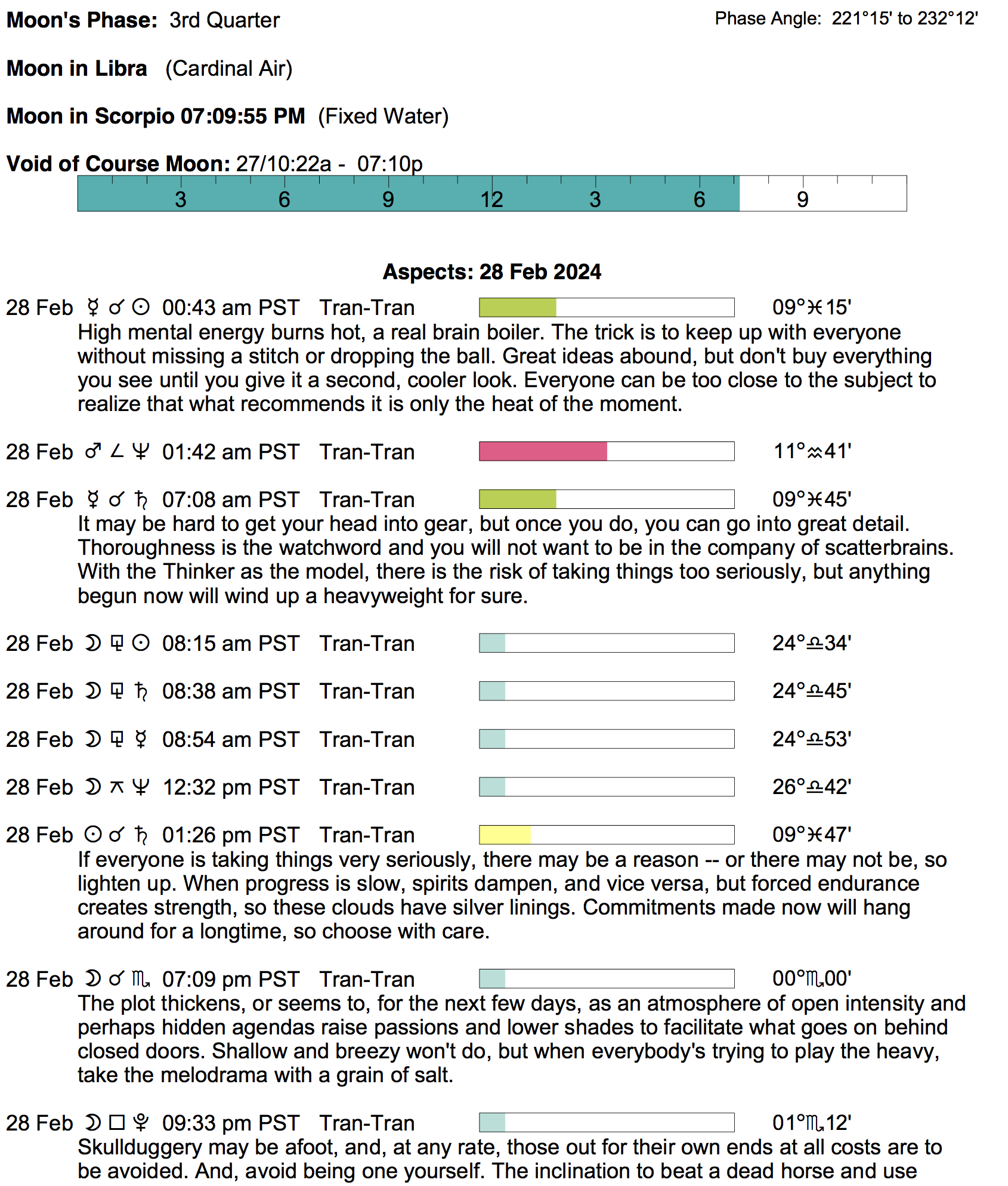 Planet Color Key: The longer the bar, the slower the aspecting planet, and the longer the duration of the planet’s transit.