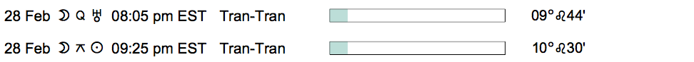 Planet Color Key: The longer the bar, the slower the aspecting planet, and the longer the duration of the planet’s transit.