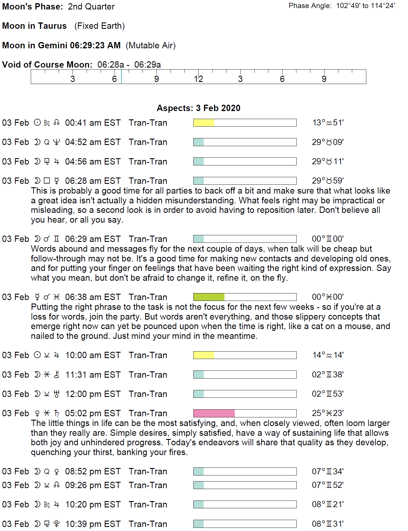 Planet Color Key: The longer the bar, the slower the aspecting planet and the longer the duration of the planet’s transit.