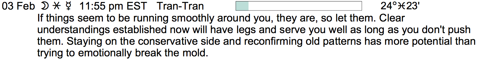 Planet Color Key: The longer the bar, the slower the aspecting planet, and the longer the duration of the planet’s transit.