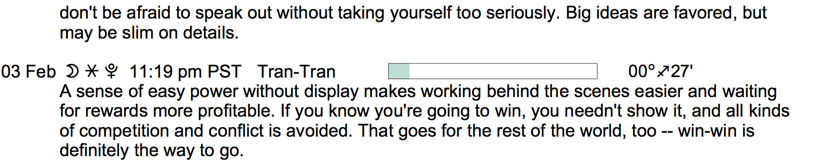 Planet Color Key: The longer the bar, the slower the aspecting planet, and the longer the duration of the planet’s transit.