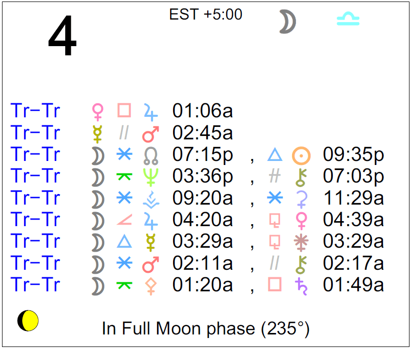 Planet Color Key: The longer the bar, the slower the aspecting planet and the longer the duration of the planet’s transit.
