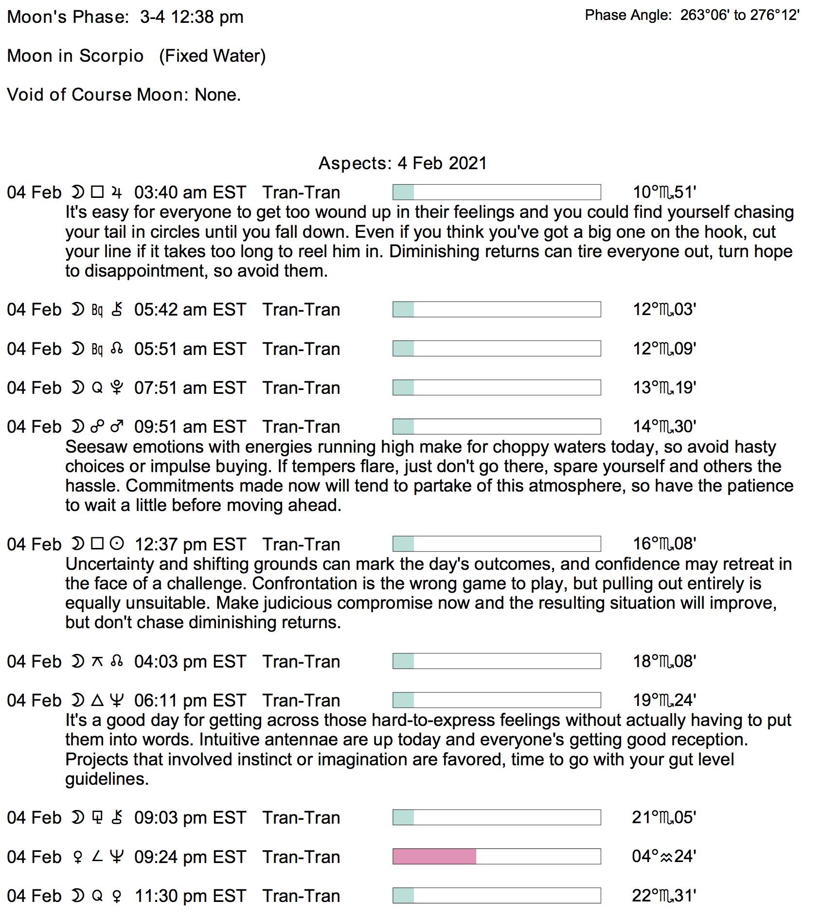 Planet Color Key: The longer the bar, the slower the aspecting planet, and the longer the duration of the planet’s transit.