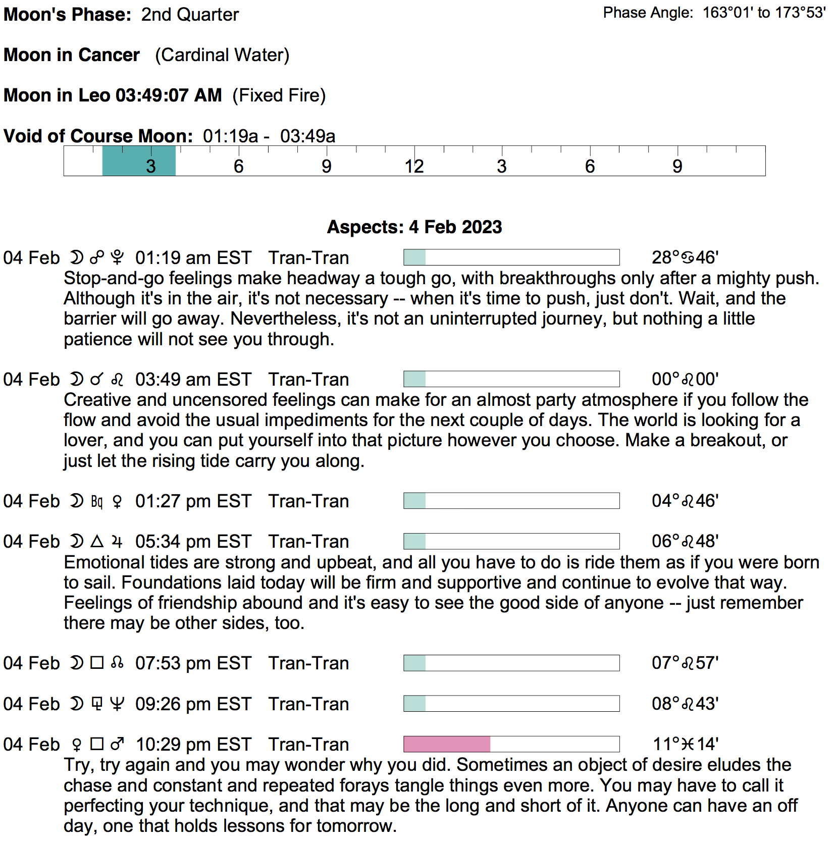 Planet Color Key: The longer the bar, the slower the aspecting planet, and the longer the duration of the planet’s transit.
