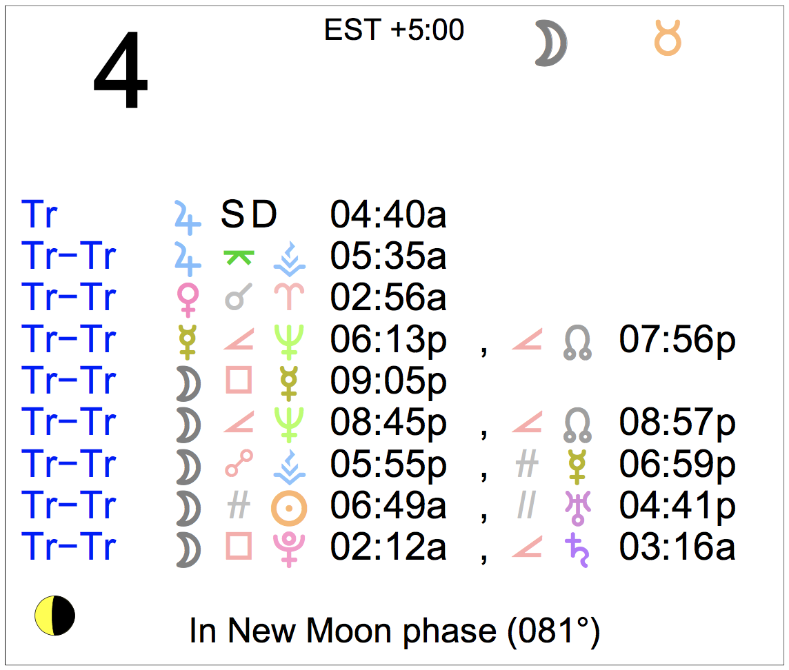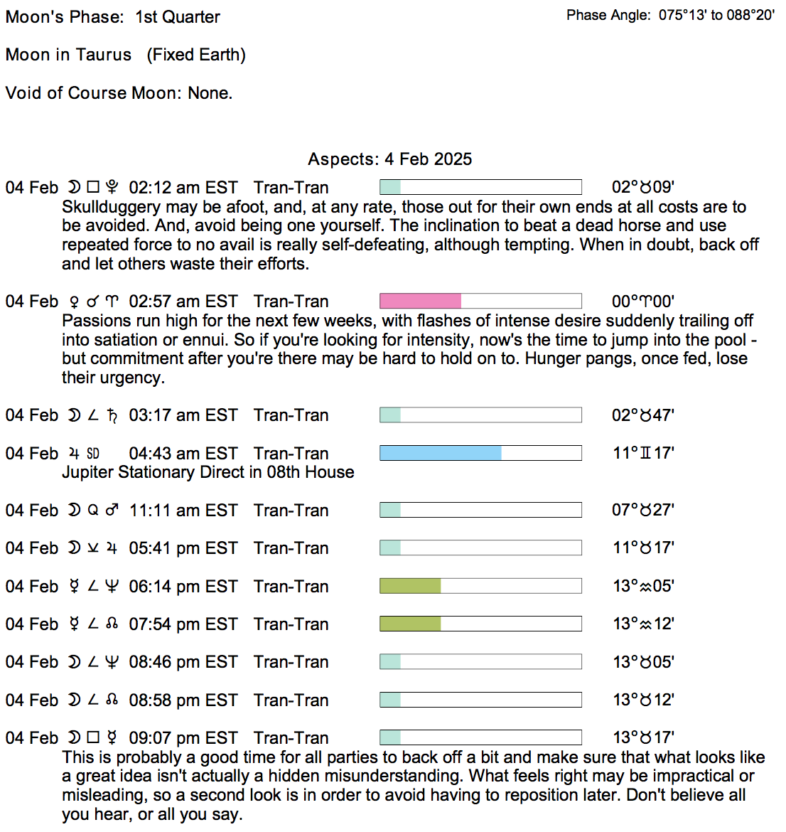 Planet Color Key: The longer the bar, the slower the aspecting planet, and the longer the duration of the planet’s transit.