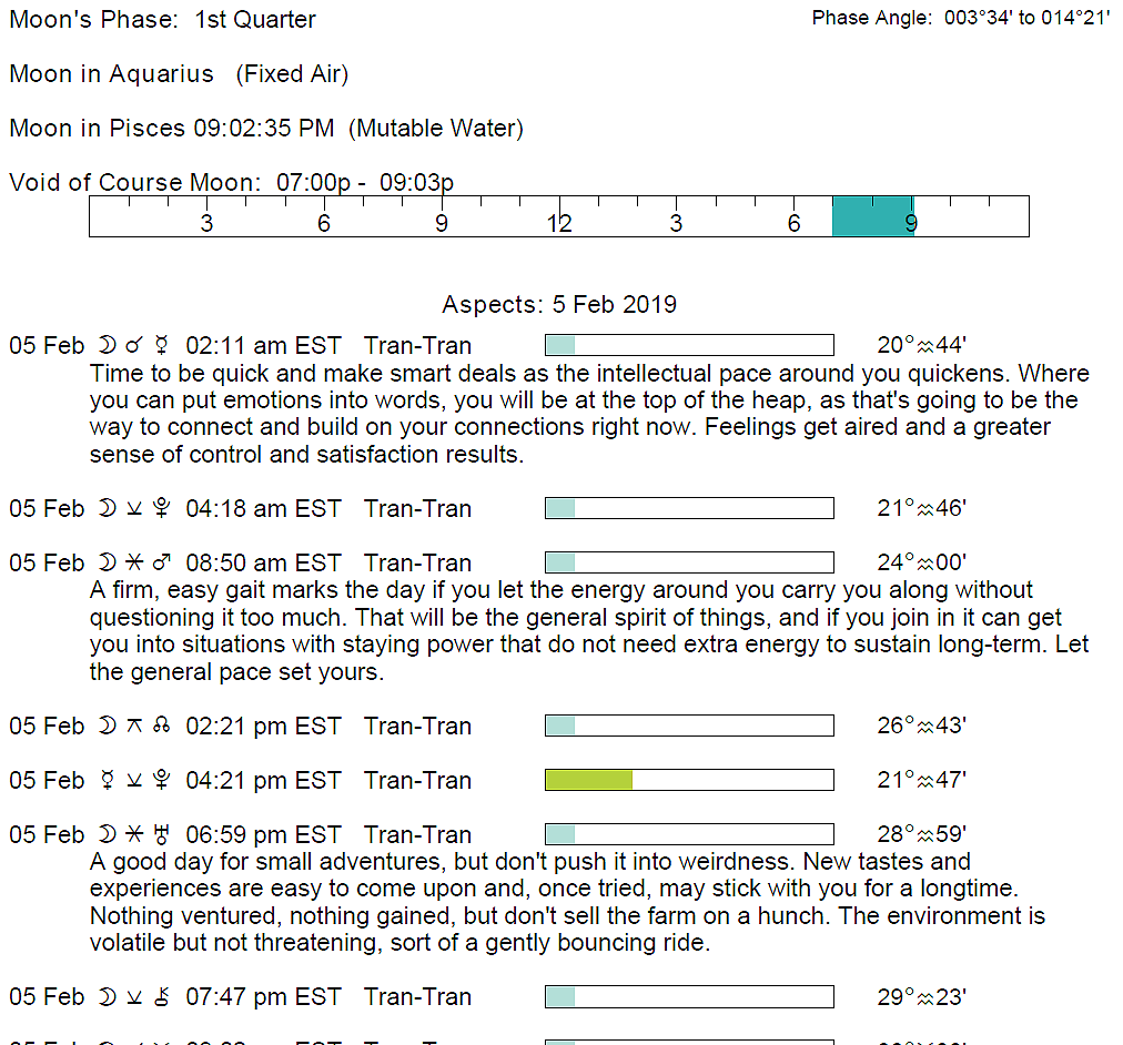 Planet Color Key: The longer the bar, the slower the aspecting planet and the longer the duration of the planet’s transit.