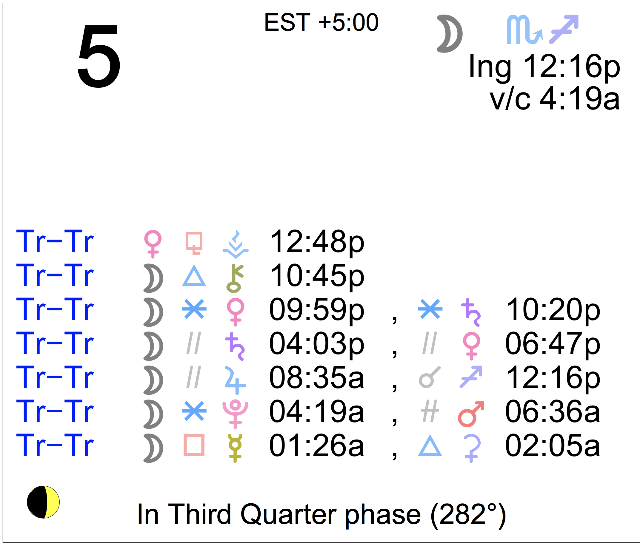 - The void Moon occurs from 4:19 AM to 12:16 PM.