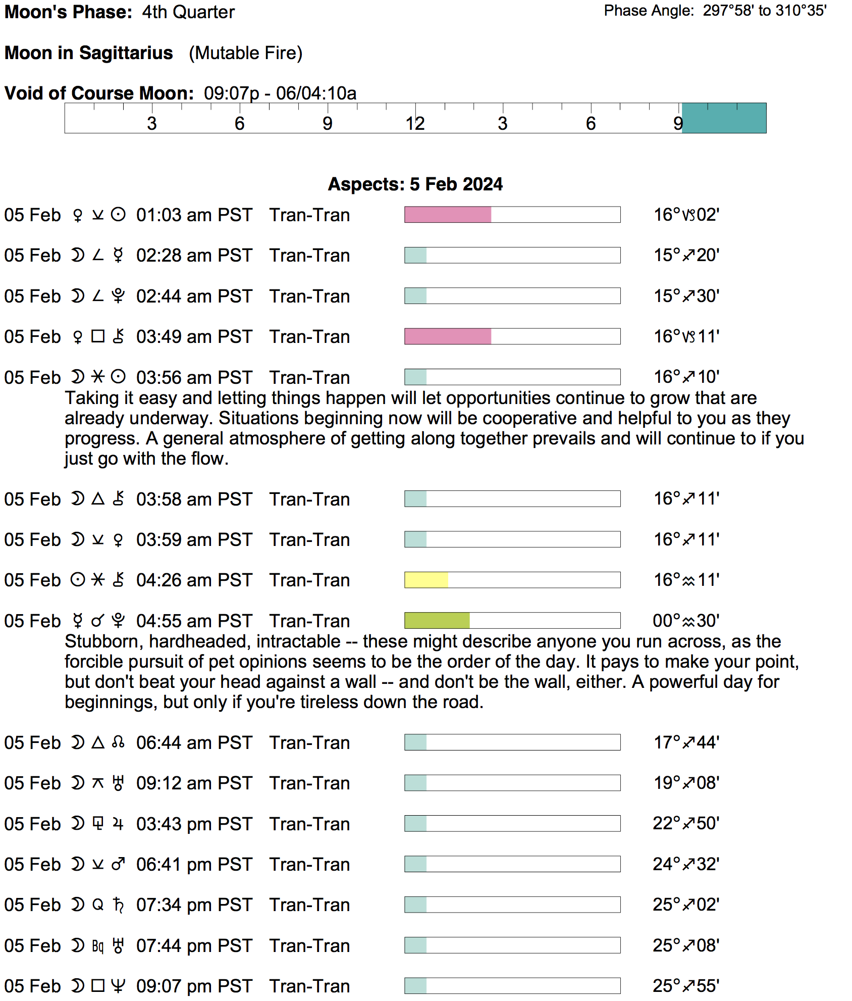 Planet Color Key: The longer the bar, the slower the aspecting planet, and the longer the duration of the planet’s transit.