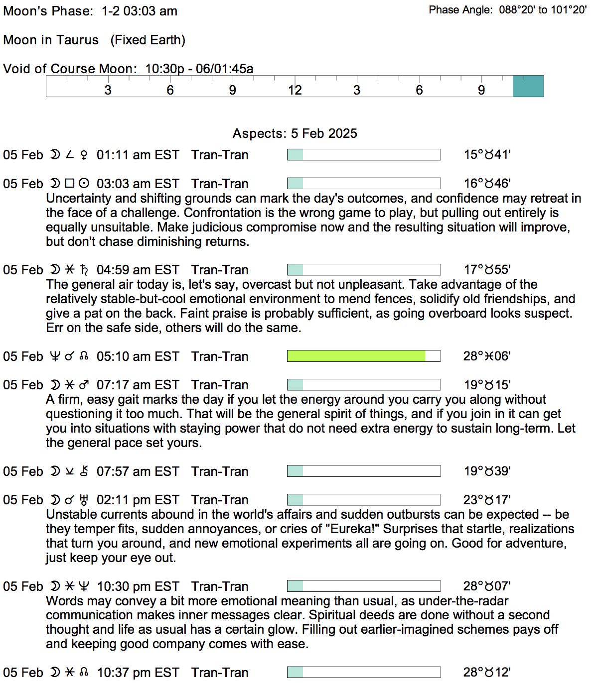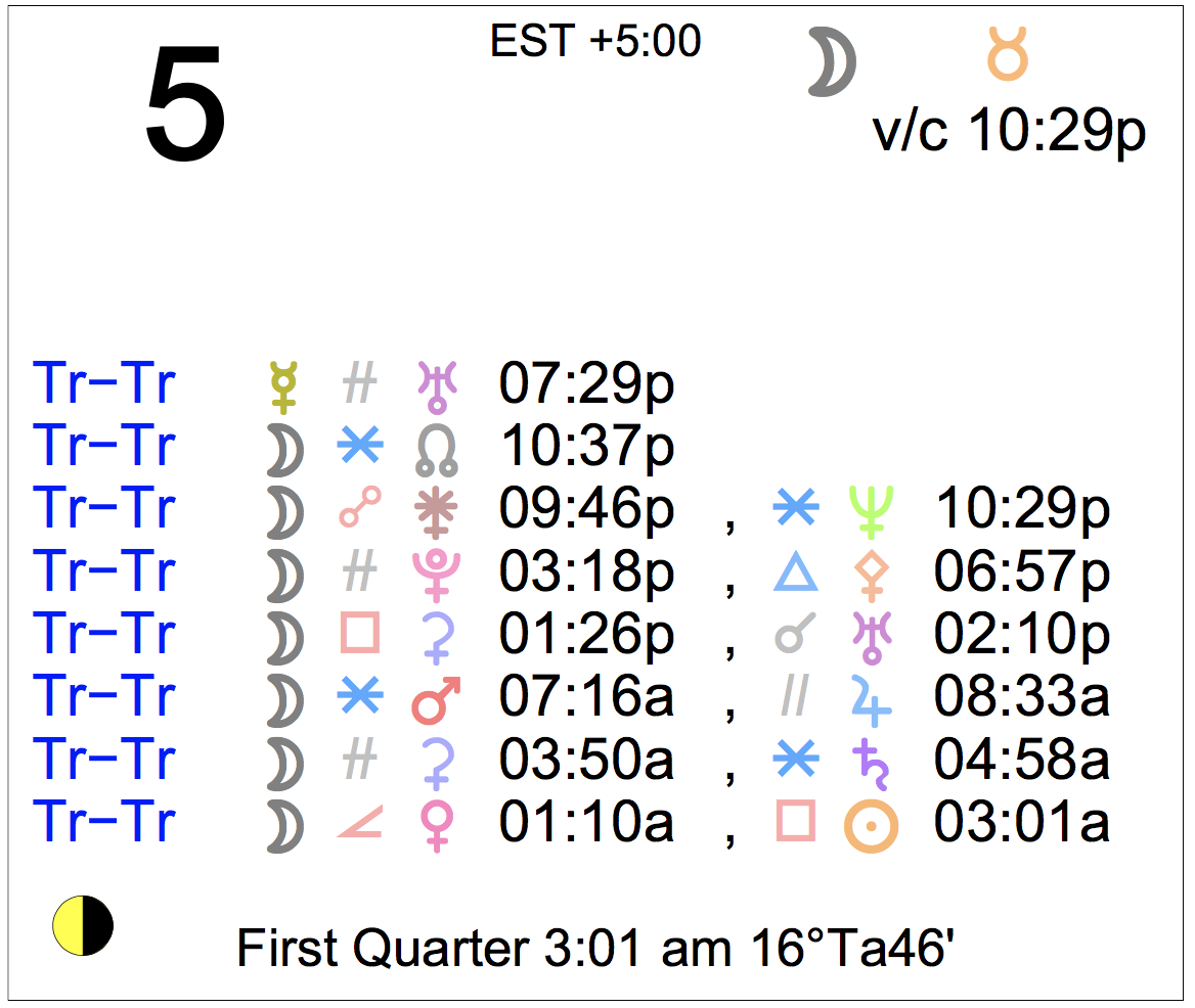 Planet Color Key: The longer the bar, the slower the aspecting planet, and the longer the duration of the planet’s transit.