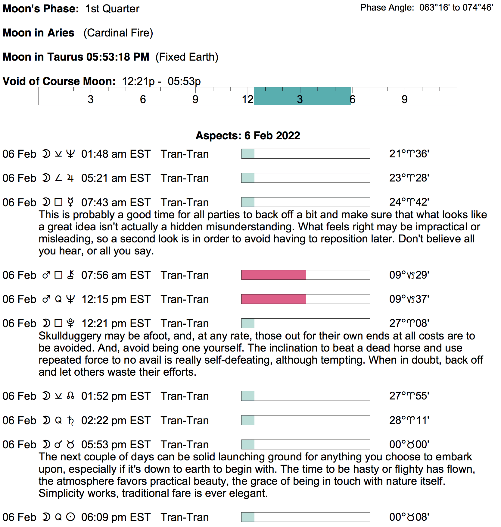 - A void Moon occurs from 12:20 PM to 5:52 PM today.