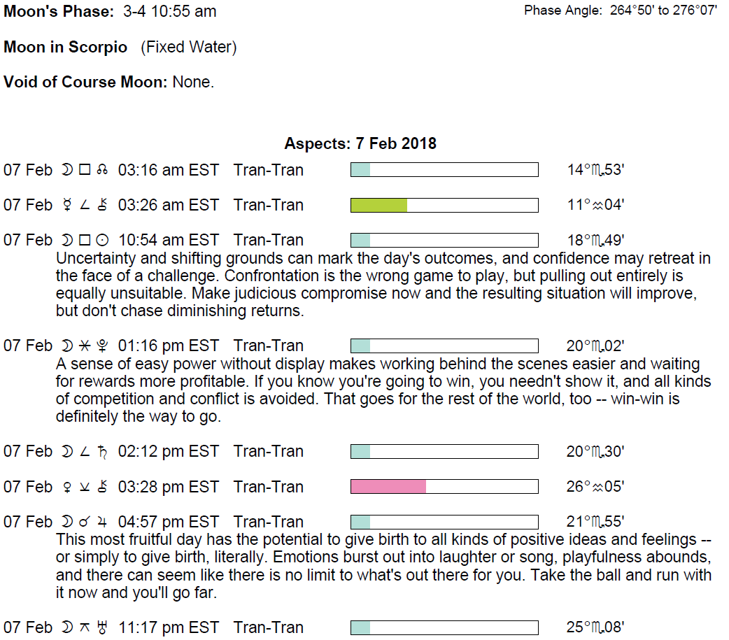 Planet Color Key: The longer the bar, the slower the aspecting planet and the longer the duration of the planet’s transit.