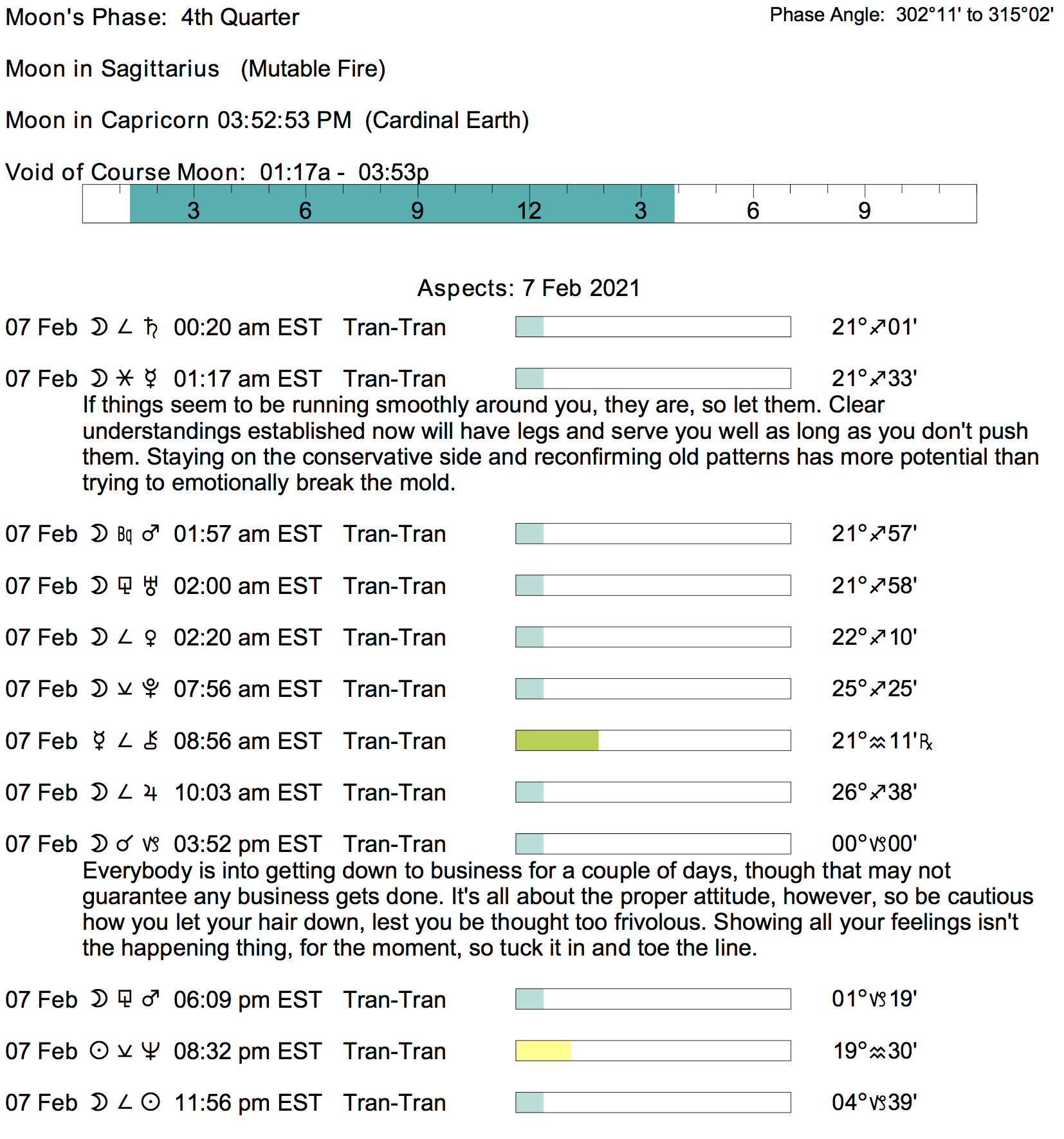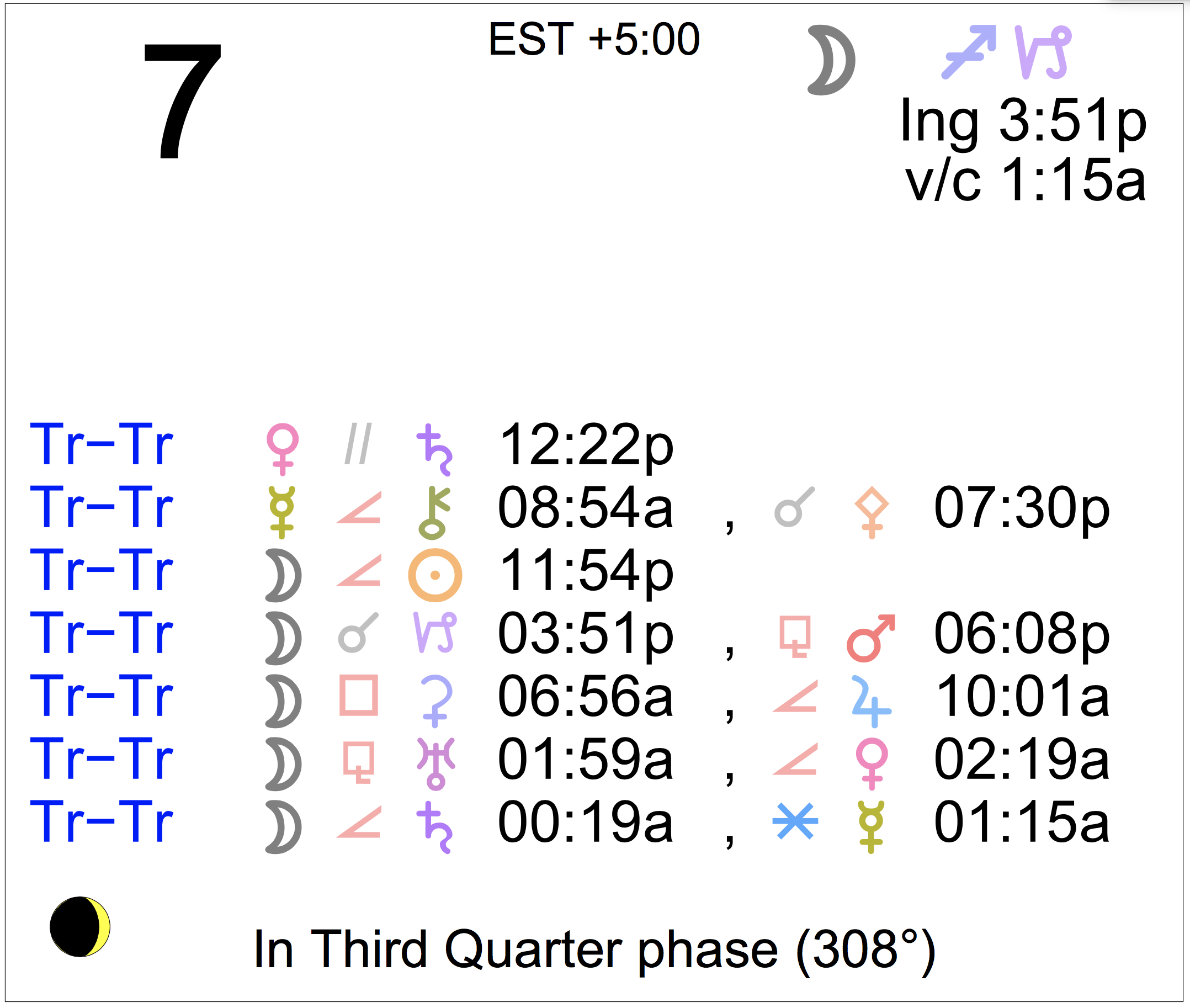 Planet Color Key: The longer the bar, the slower the aspecting planet, and the longer the duration of the planet’s transit.