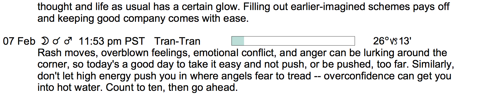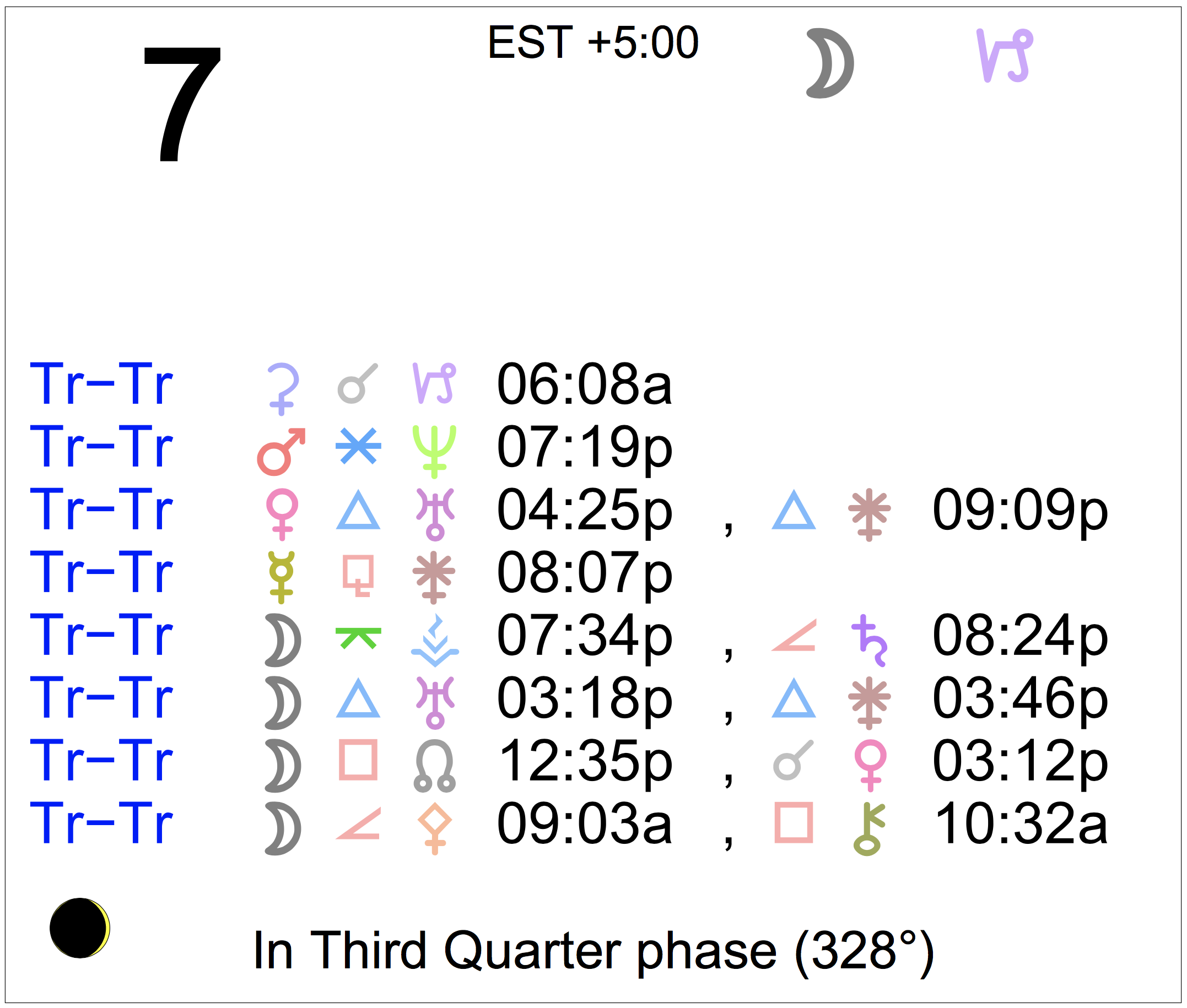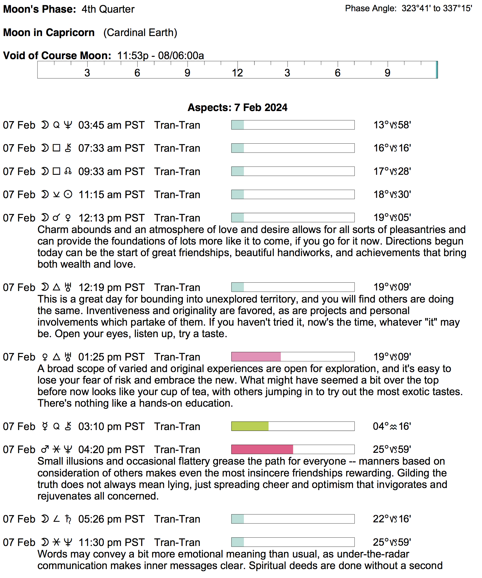 Planet Color Key: The longer the bar, the slower the aspecting planet, and the longer the duration of the planet’s transit.