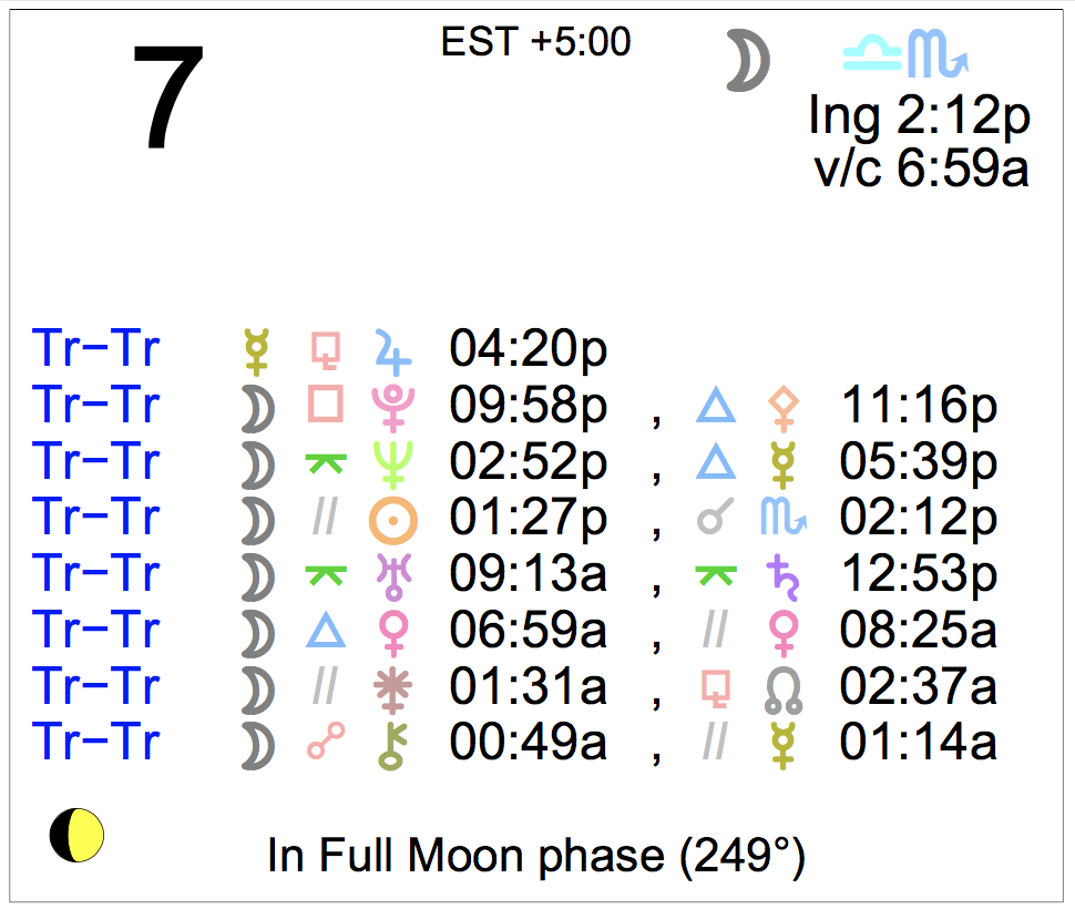 Planet Color Key: The longer the bar, the slower the aspecting planet, and the longer the duration of the planet’s transit.