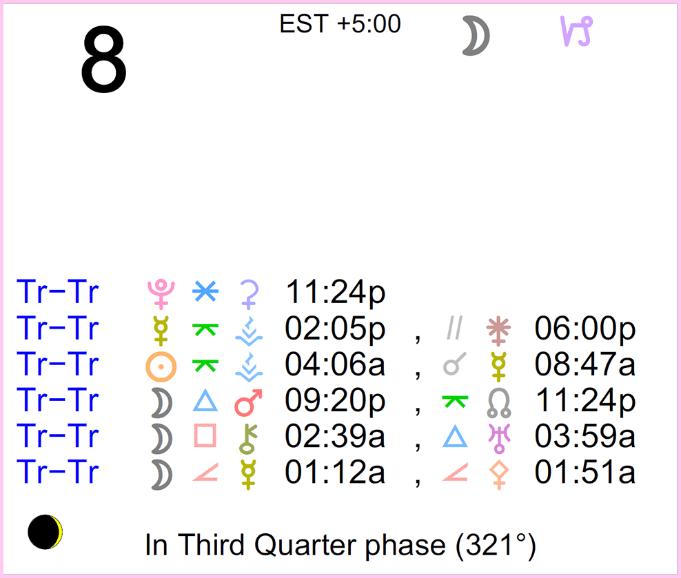 Planet Color Key: The longer the bar, the slower the aspecting planet, and the longer the duration of the planet’s transit.
