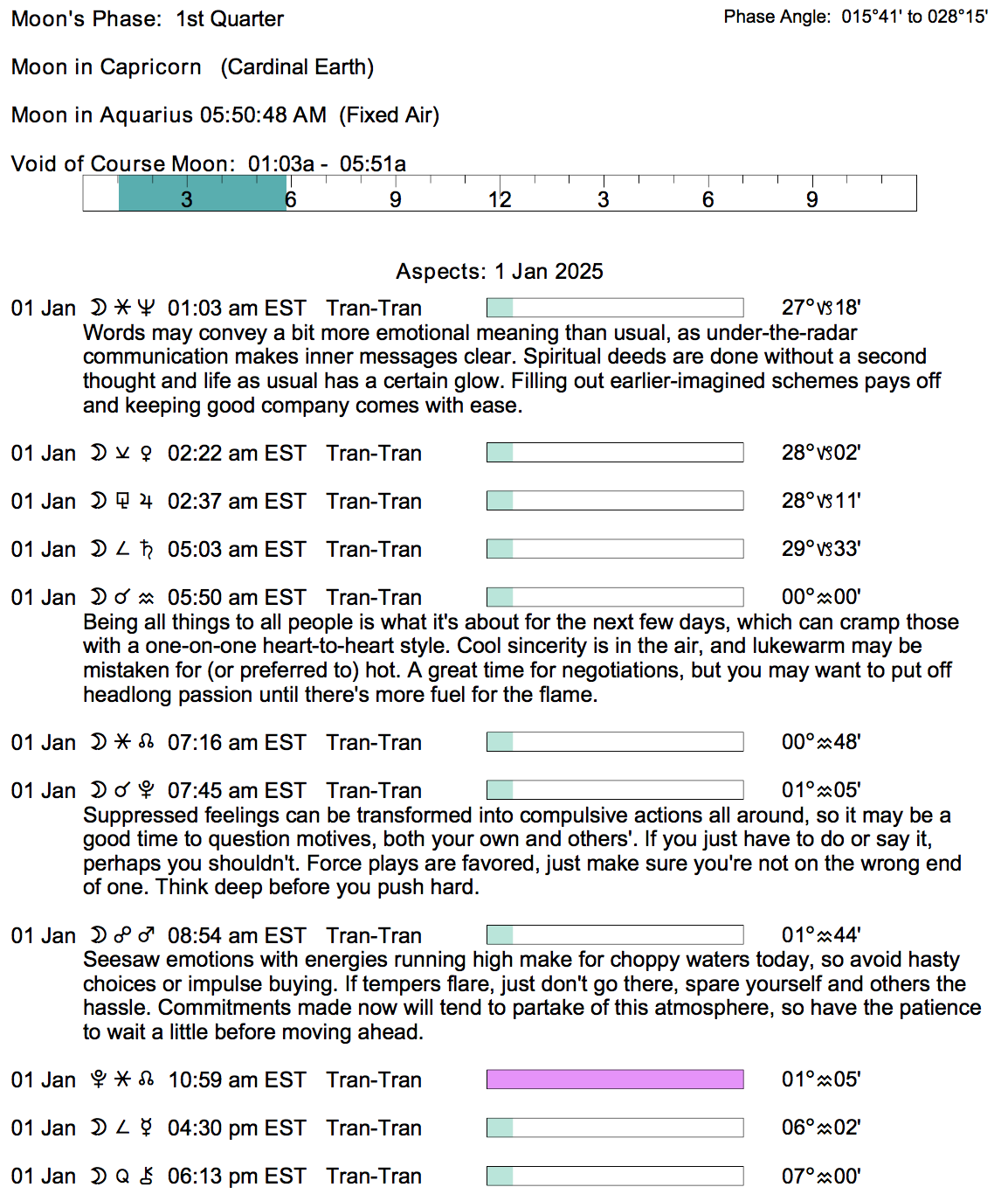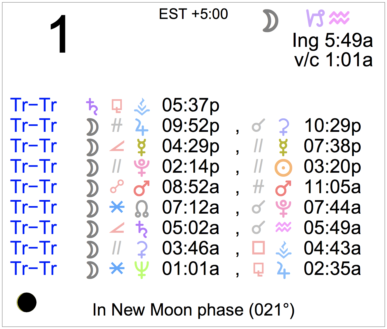 - A void Moon period occurs from 1:01 AM to 5:49 AM today.