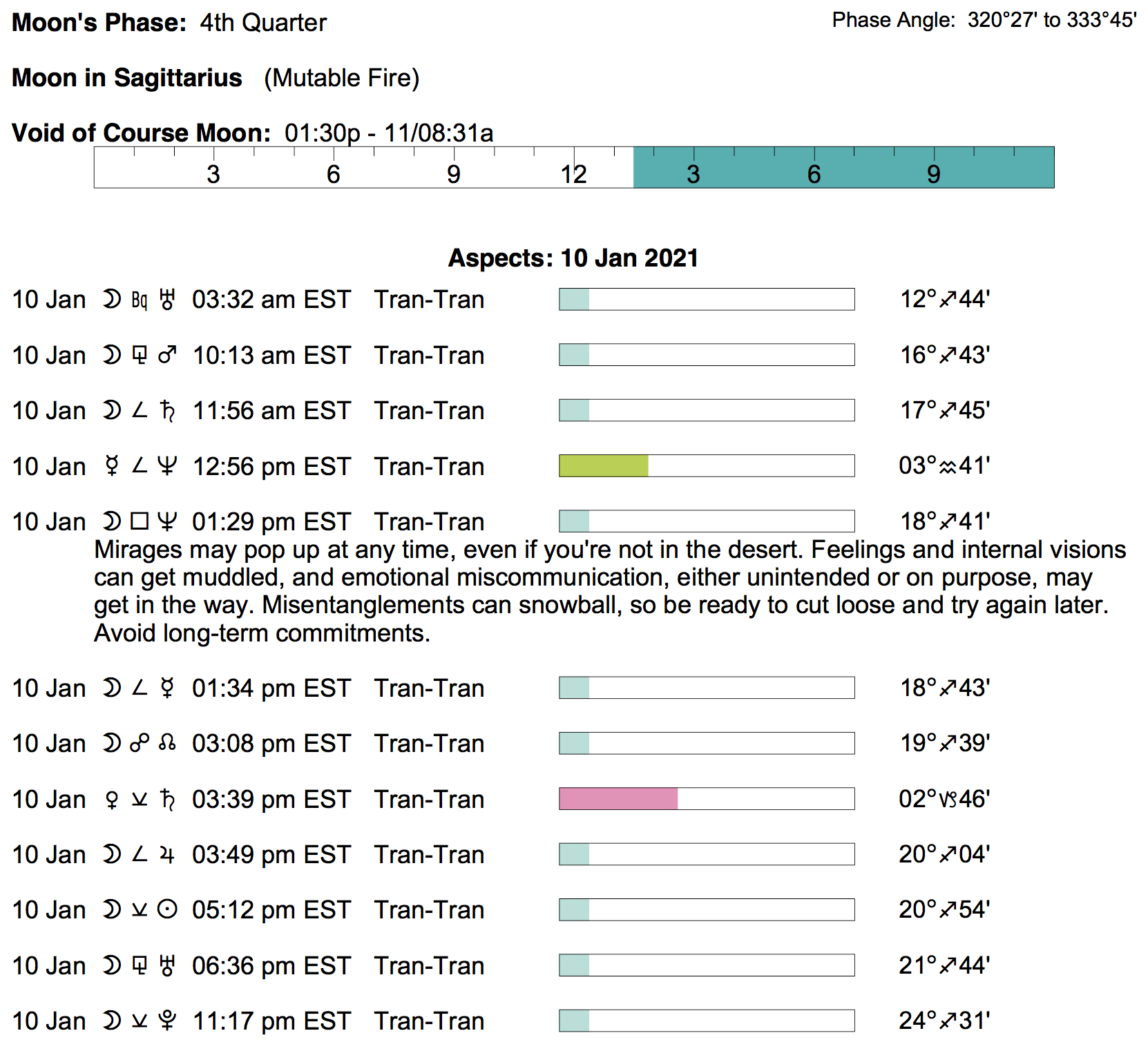 Planet Color Key: The longer the bar, the slower the aspecting planet, and the longer the duration of the planet’s transit.