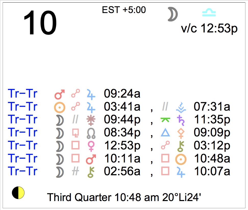 Planet Color Key: The longer the bar, the slower the aspecting planet, and the longer the duration of the planet’s transit.