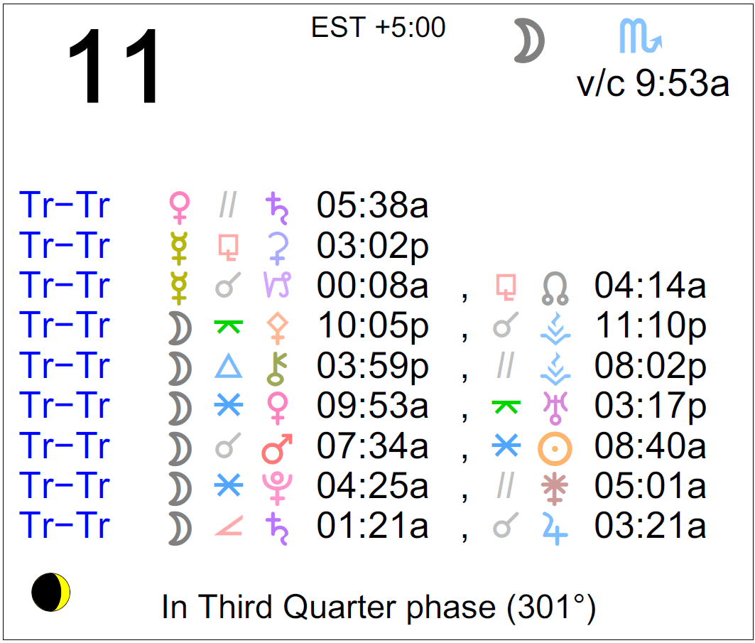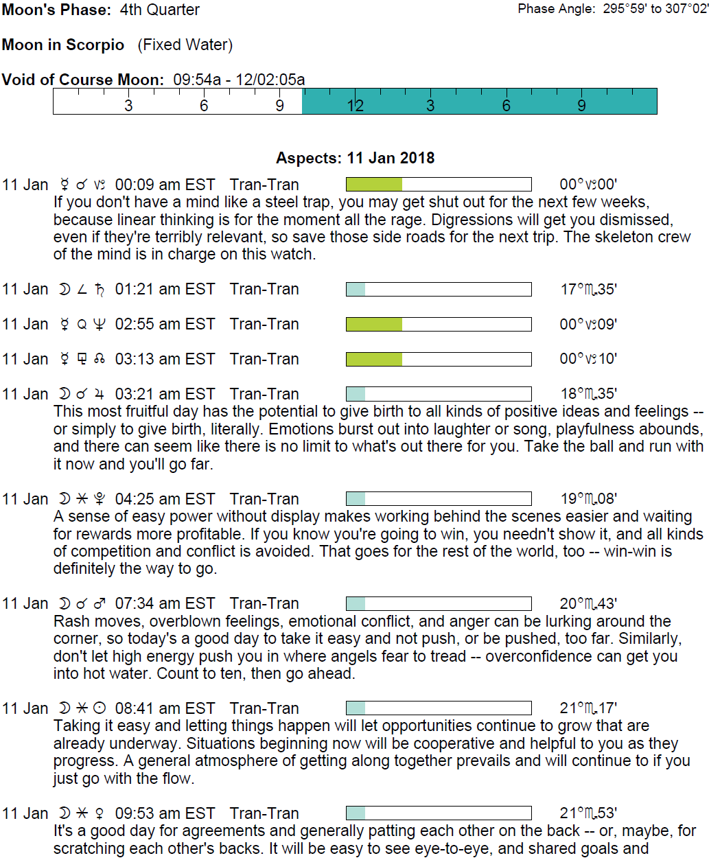 Planet Color Key: The longer the bar, the slower the aspecting planet and the longer the duration of the planet’s transit.