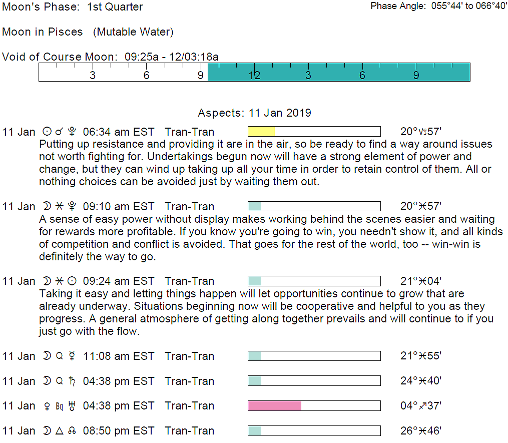 Planet Color Key: The longer the bar, the slower the aspecting planet and the longer the duration of the planet’s transit.