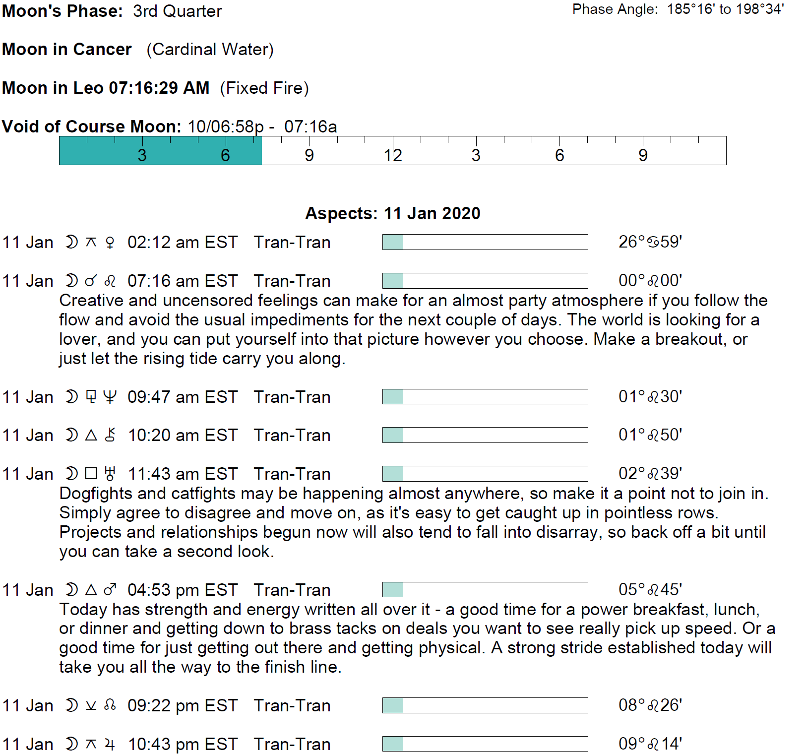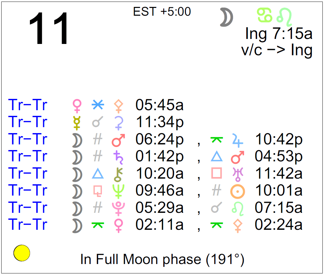 Planet Color Key: The longer the bar, the slower the aspecting planet and the longer the duration of the planet’s transit.