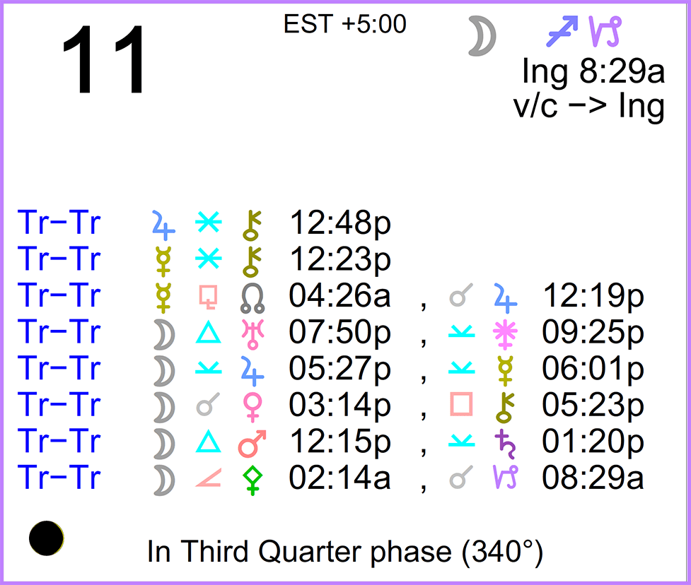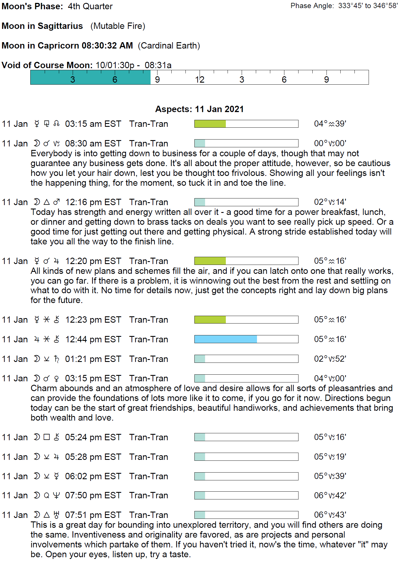 Planet Color Key: The longer the bar, the slower the aspecting planet, and the longer the duration of the planet’s transit.
