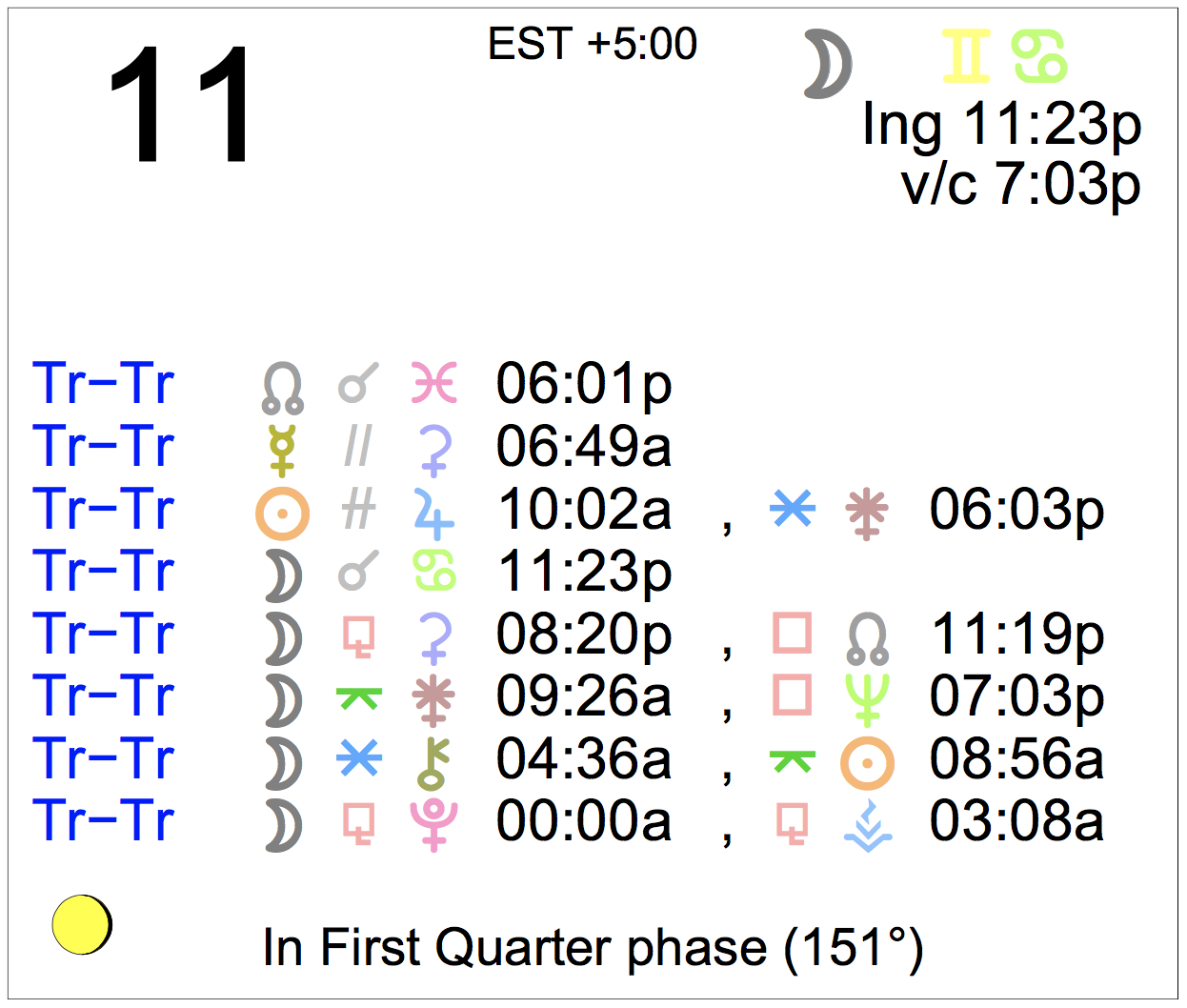 - The Moon is in Gemini until 11:23 PM, after which the Moon is in Cancer.
