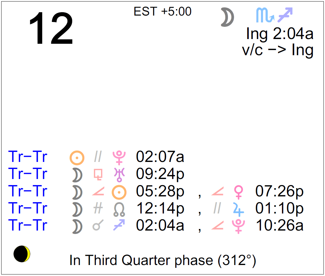 Note that the Moon moves at a rate of approximately one degree every 2 hours so that if an aspect involving the Moon is applying and has an orb of 5 degrees, the aspect will perfect (be exact) in about 10 hours. If the Moon is separating from an aspect with an orb of 2 degrees, it has already formed said aspect approximately 4 hours ago (since the following are positions at noon today, then it would have occurred at about 8 AM today).