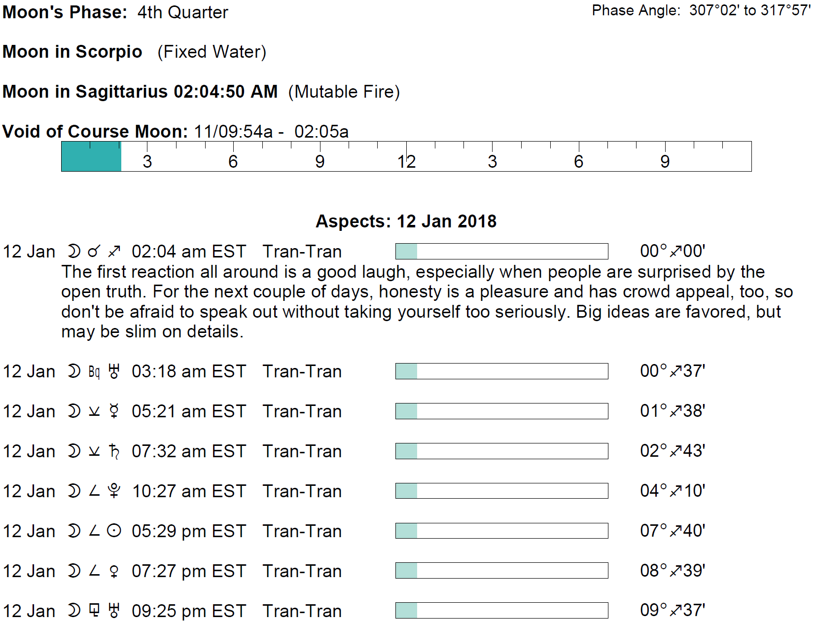 The following aspects (major only) and positions are at noon (EST) on January 12th: