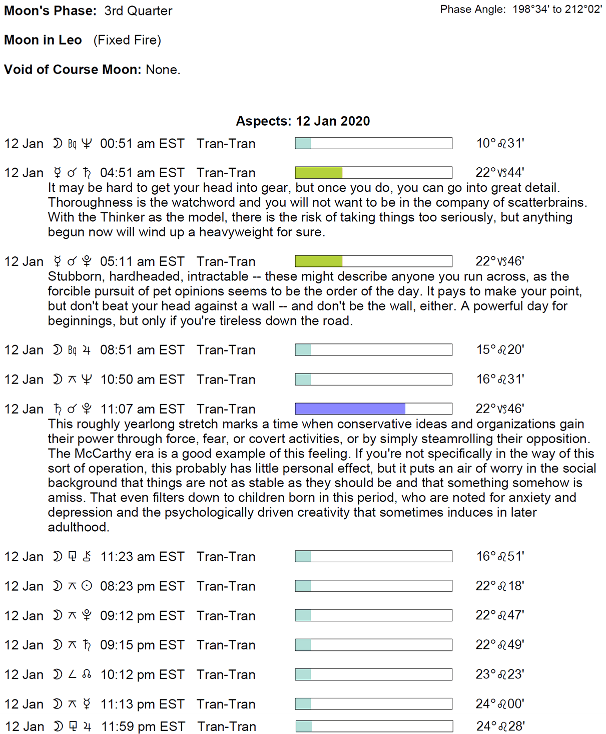 Planet Color Key: The longer the bar, the slower the aspecting planet and the longer the duration of the planet’s transit.