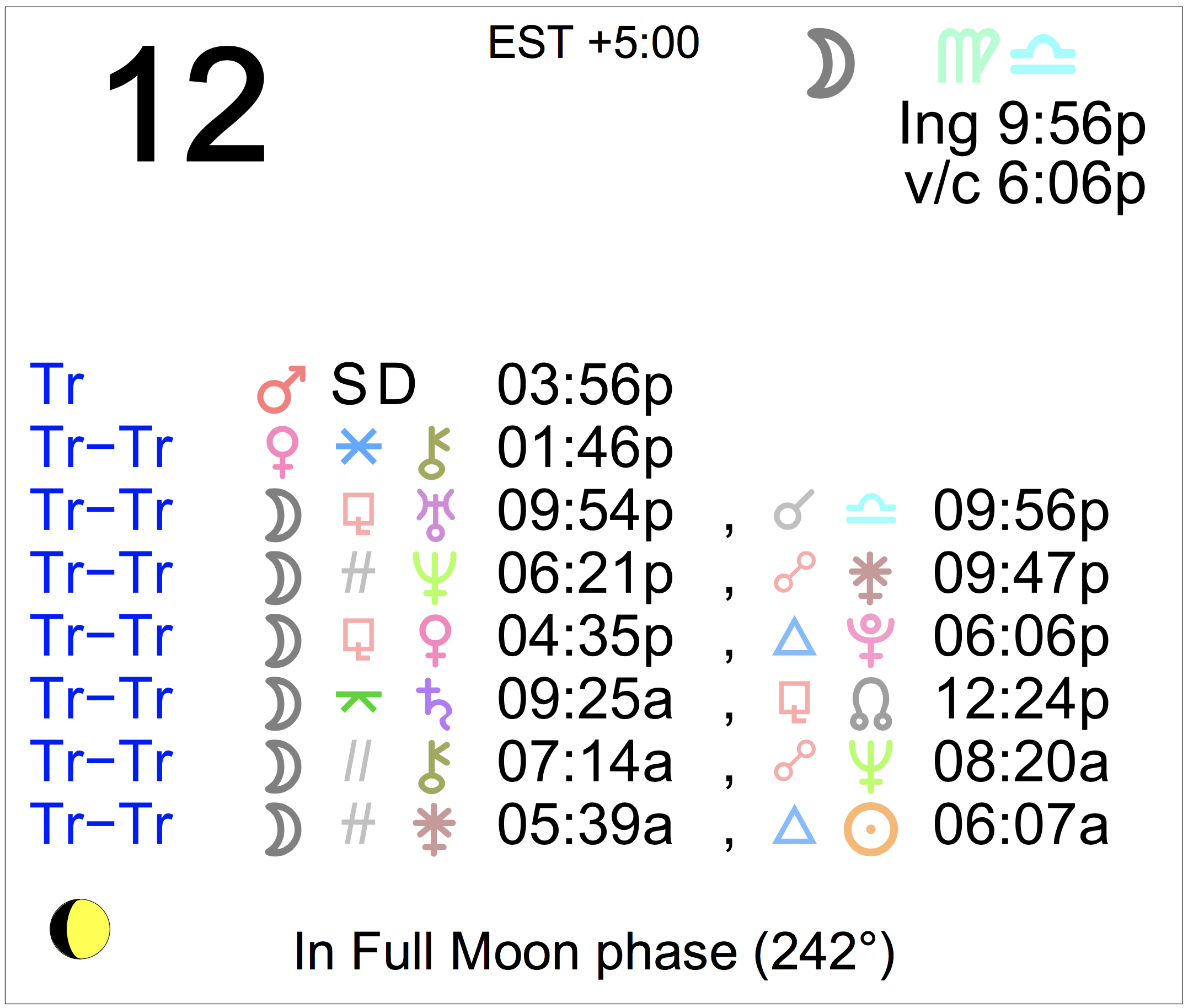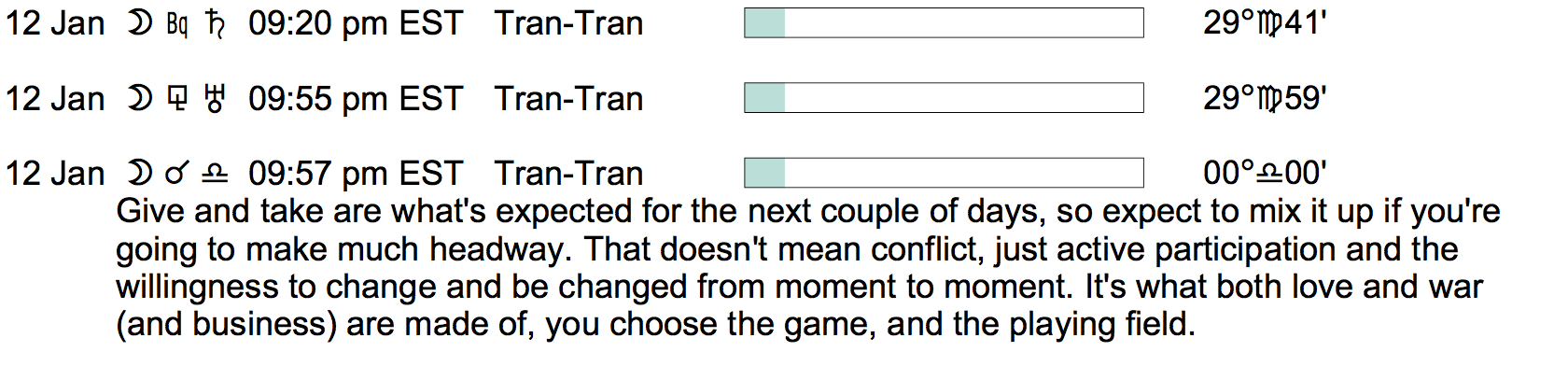 Planet Color Key: The longer the bar, the slower the aspecting planet, and the longer the duration of the planet’s transit.