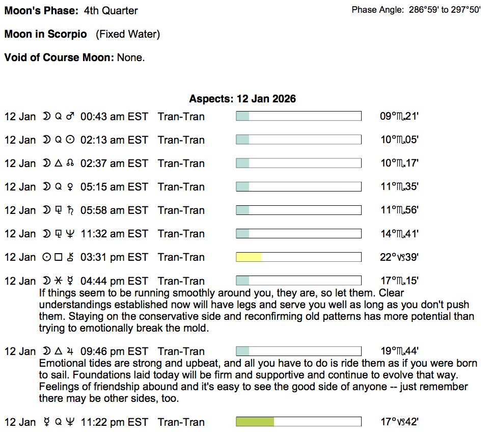 Planet Color Key: The longer the bar, the slower the aspecting planet, and the longer the duration of the planet’s transit.