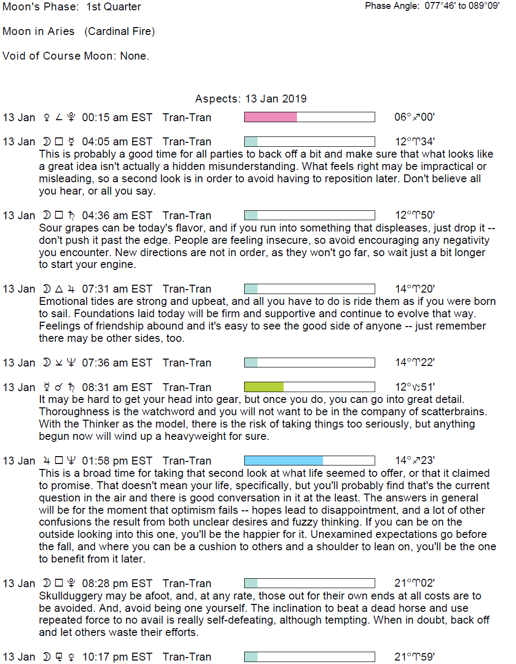 Planet Color Key: The longer the bar, the slower the aspecting planet and the longer the duration of the planet’s transit.