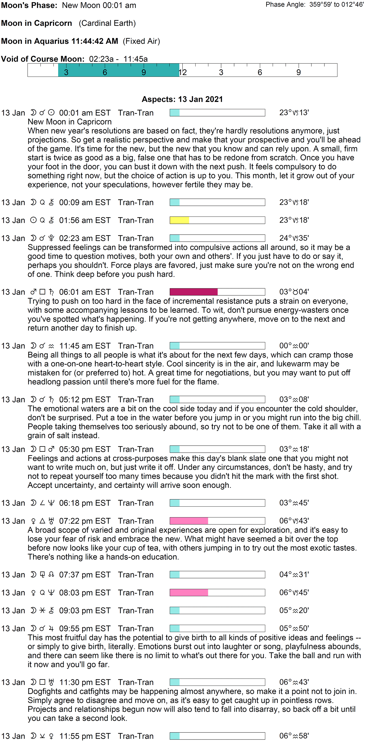 Planet Color Key: The longer the bar, the slower the aspecting planet, and the longer the duration of the planet’s transit.