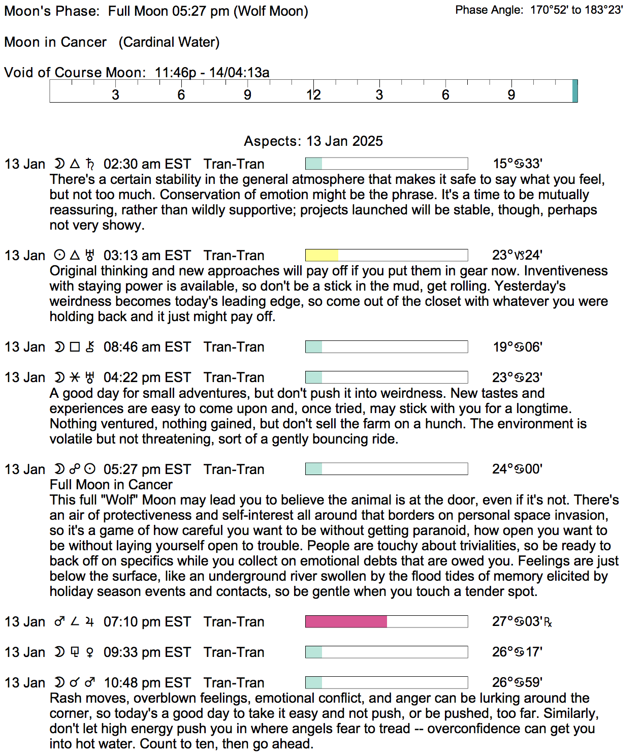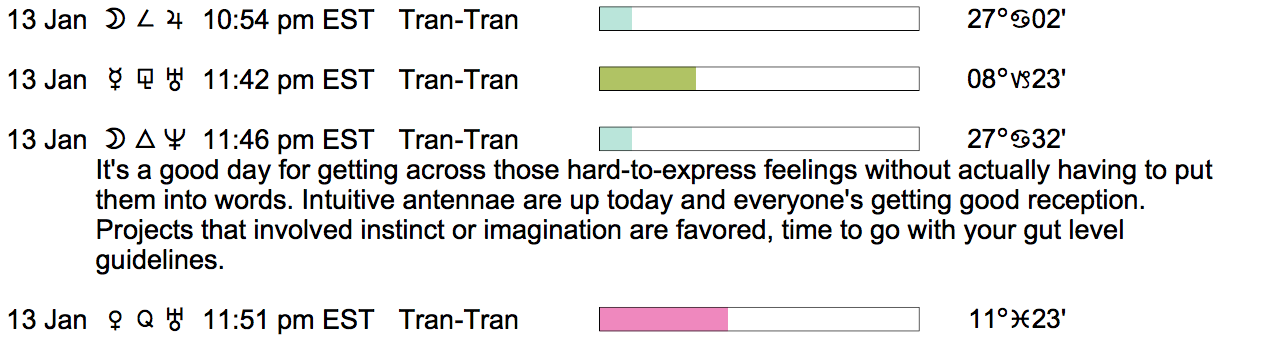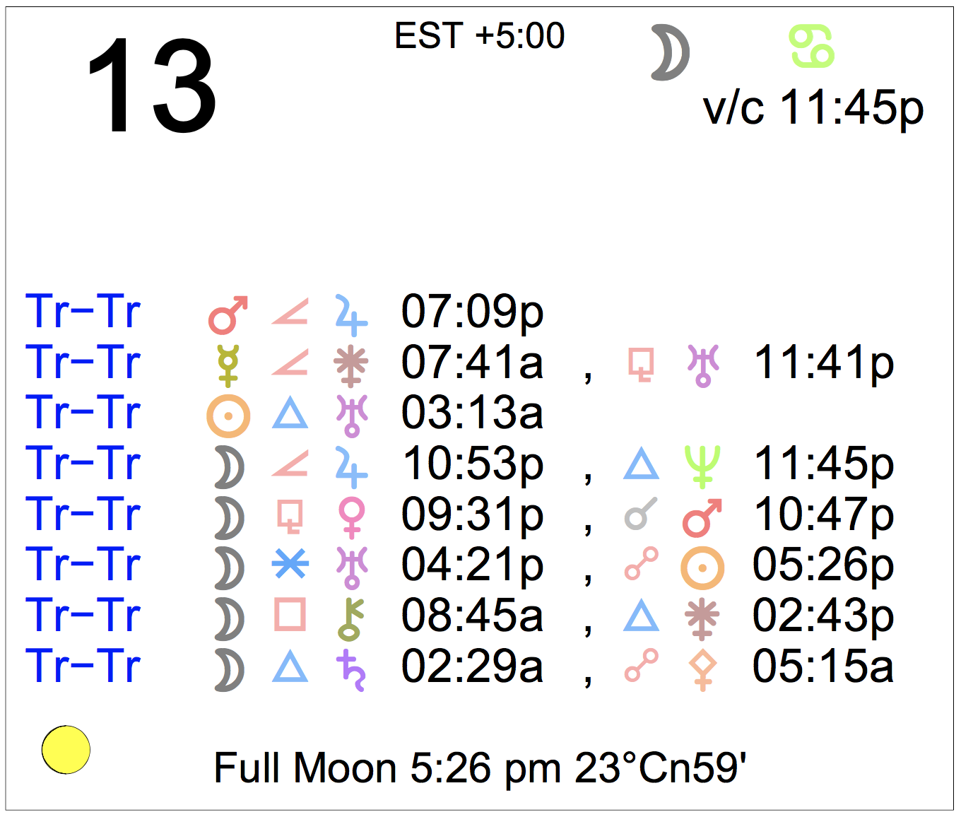 Planet Color Key: The longer the bar, the slower the aspecting planet, and the longer the duration of the planet’s transit.