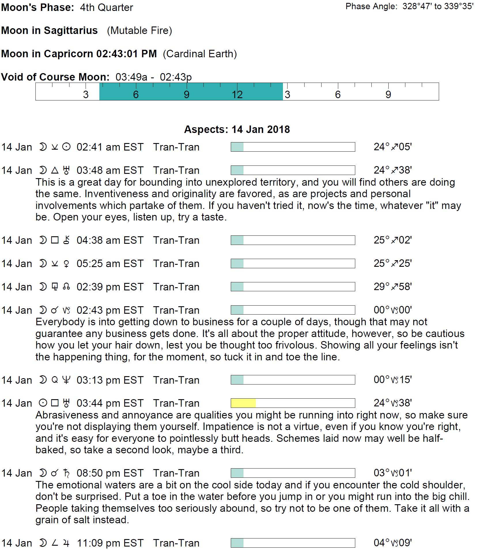 The following aspects (major only) and positions are at noon (EST) on January 14th:
