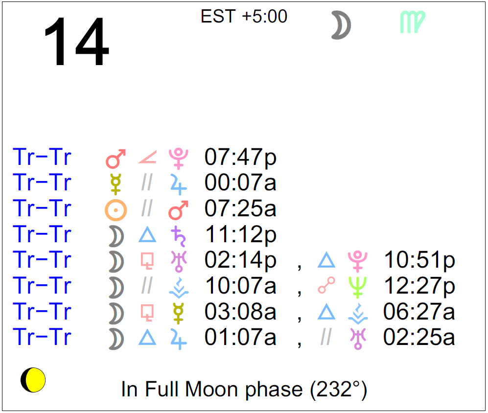 Planet Color Key: The longer the bar, the slower the aspecting planet and the longer the duration of the planet’s transit.