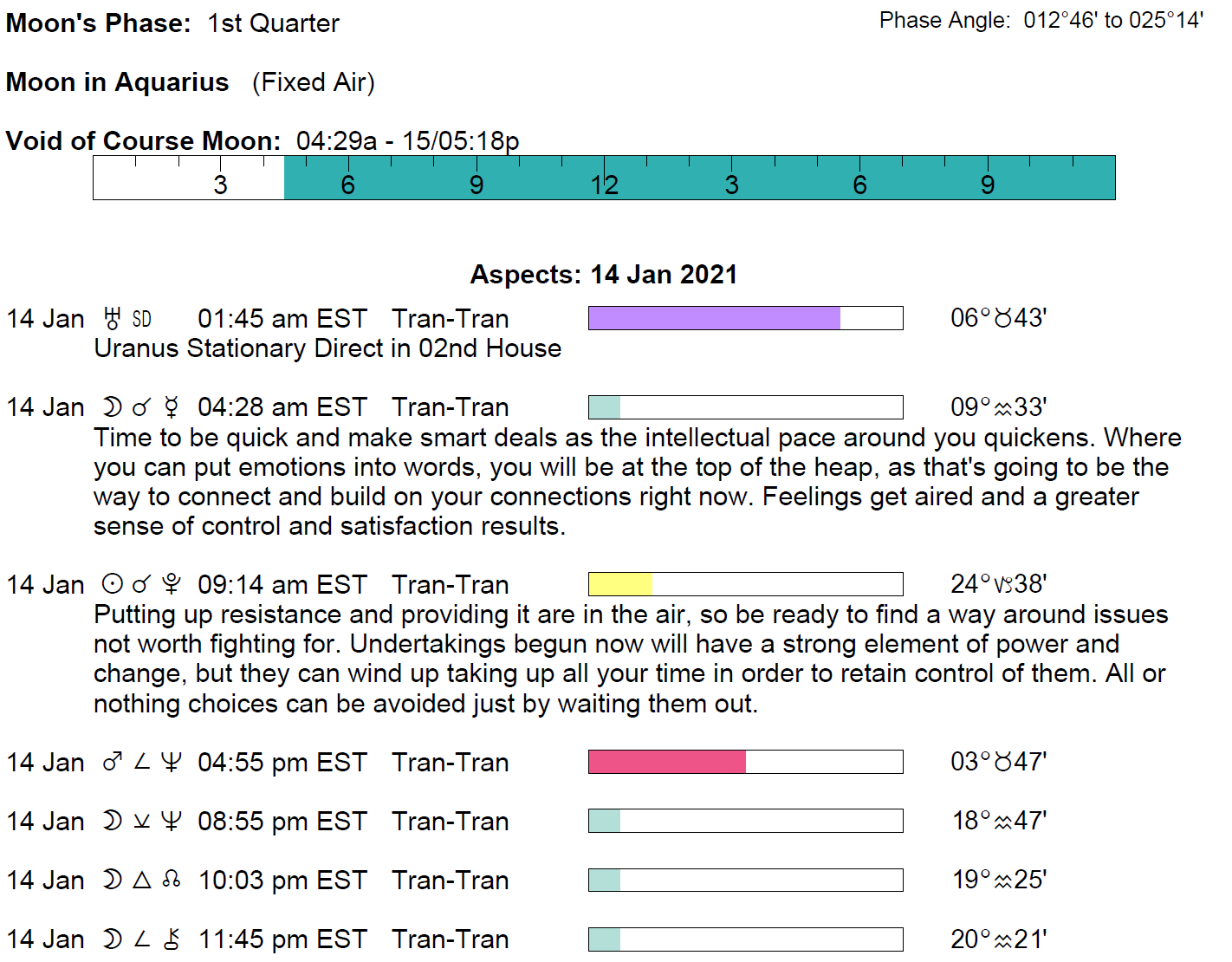 Planet Color Key: The longer the bar, the slower the aspecting planet, and the longer the duration of the planet’s transit.