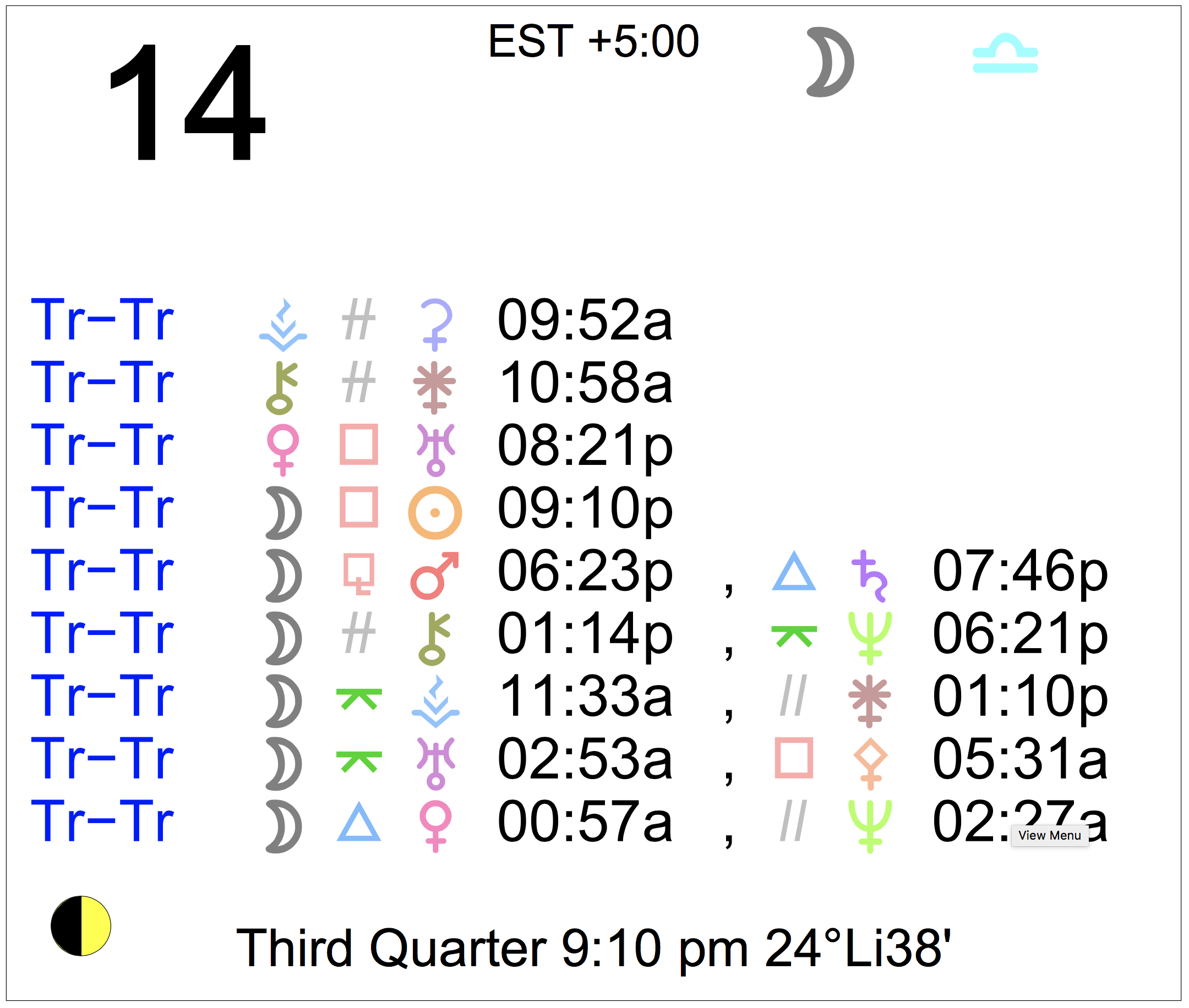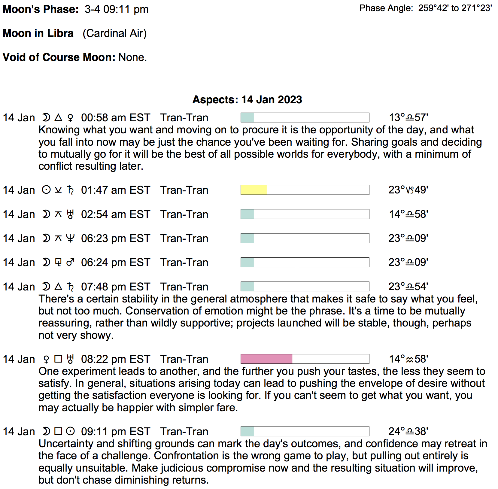 Planet Color Key: The longer the bar, the slower the aspecting planet, and the longer the duration of the planet’s transit.