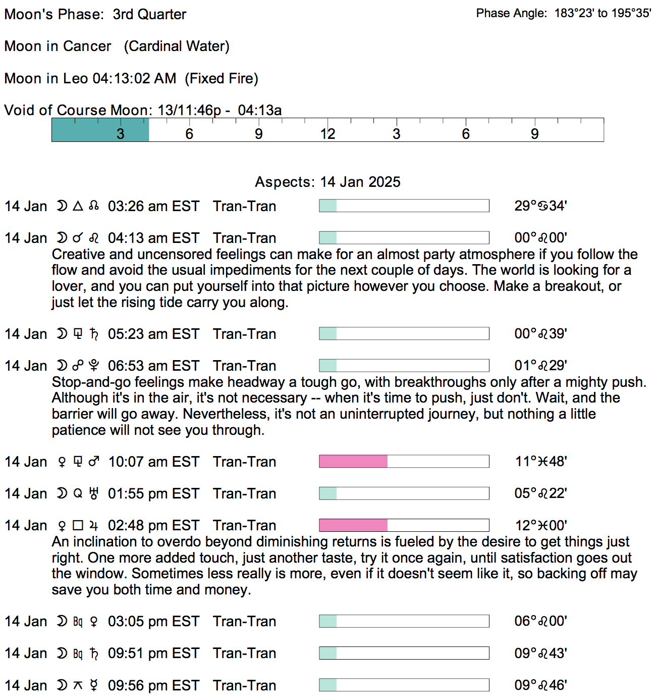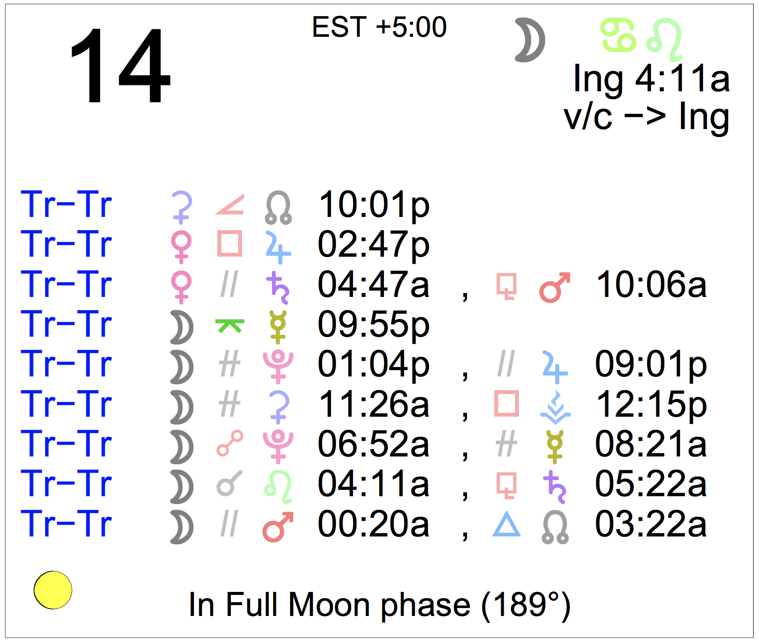 Planet Color Key: The longer the bar, the slower the aspecting planet, and the longer the duration of the planet’s transit.