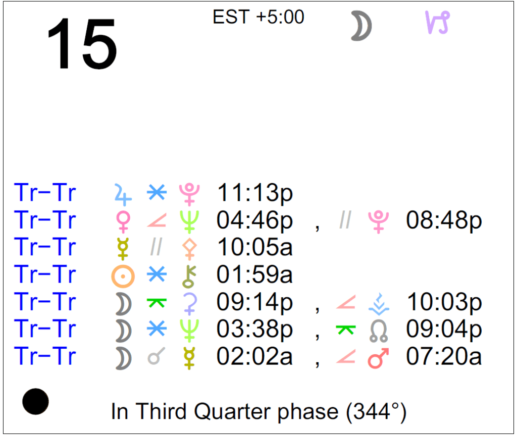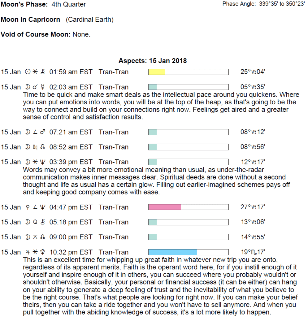 The following aspects (major only) and positions are at noon (EST) on January 15th: