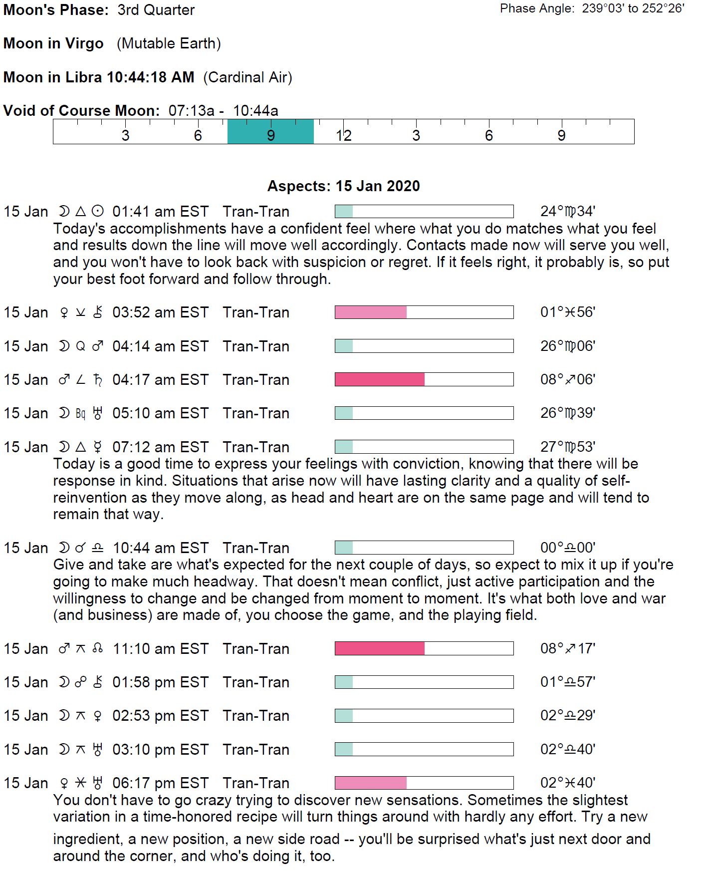 Planet Color Key: The longer the bar, the slower the aspecting planet and the longer the duration of the planet’s transit.