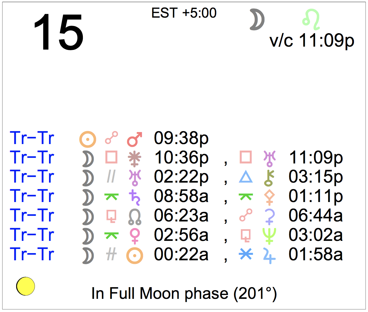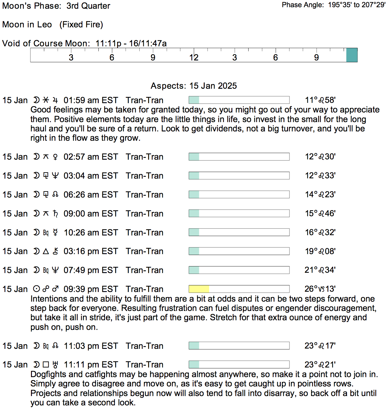 Planet Color Key: The longer the bar, the slower the aspecting planet, and the longer the duration of the planet’s transit.