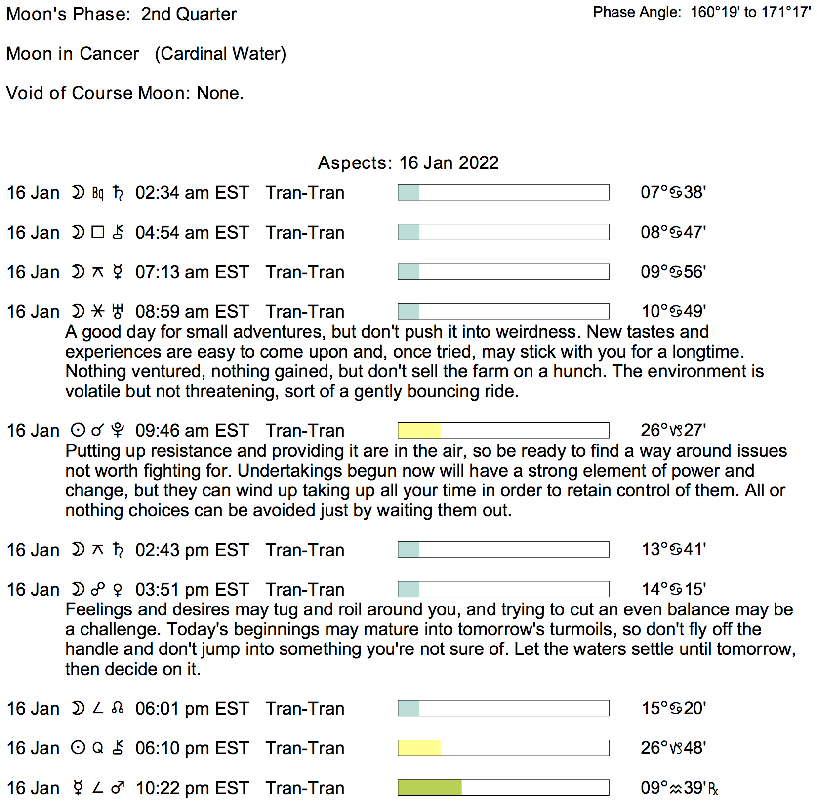 Planet Color Key: The longer the bar, the slower the aspecting planet, and the longer the duration of the planet’s transit.