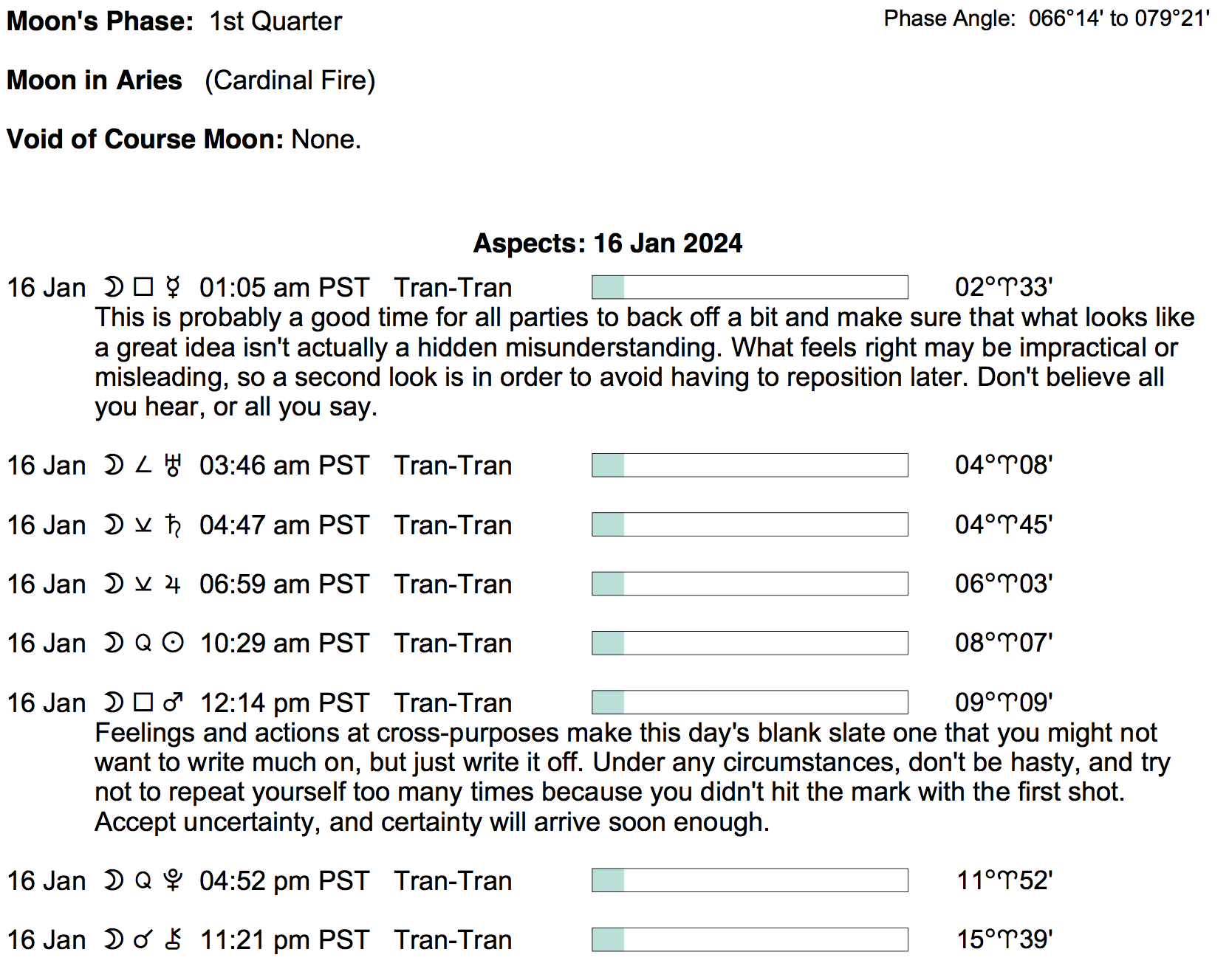Planet Color Key: The longer the bar, the slower the aspecting planet, and the longer the duration of the planet’s transit.