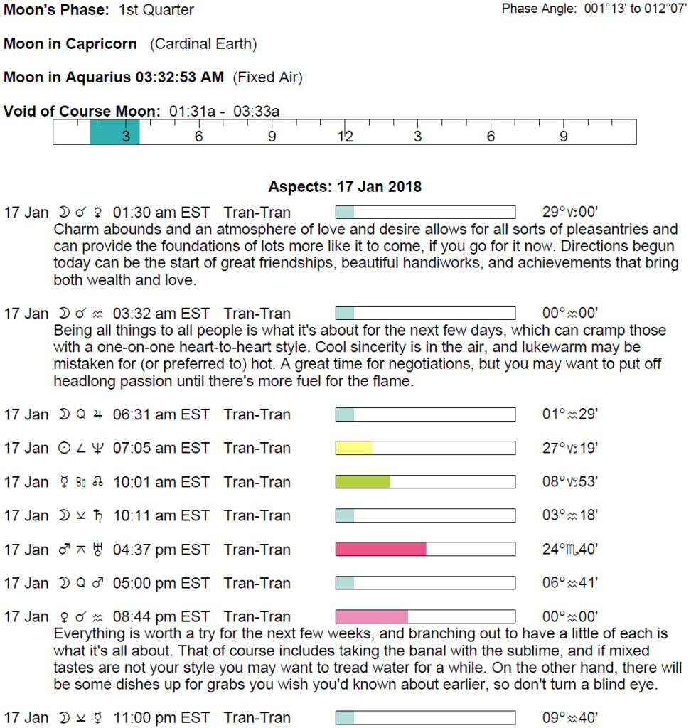 Planet Color Key: The longer the bar, the slower the aspecting planet and the longer the duration of the planet’s transit.