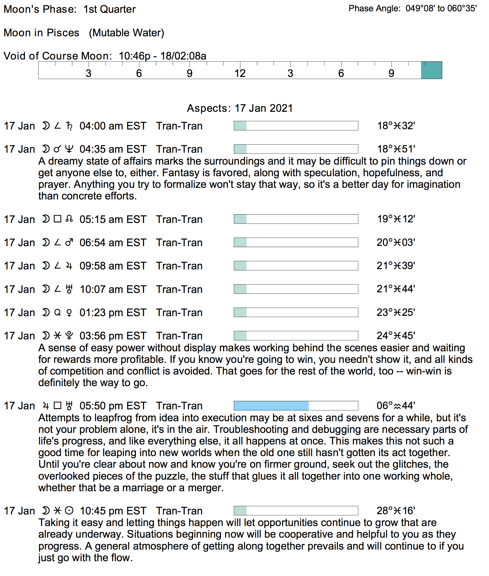 Planet Color Key: The longer the bar, the slower the aspecting planet, and the longer the duration of the planet’s transit.
